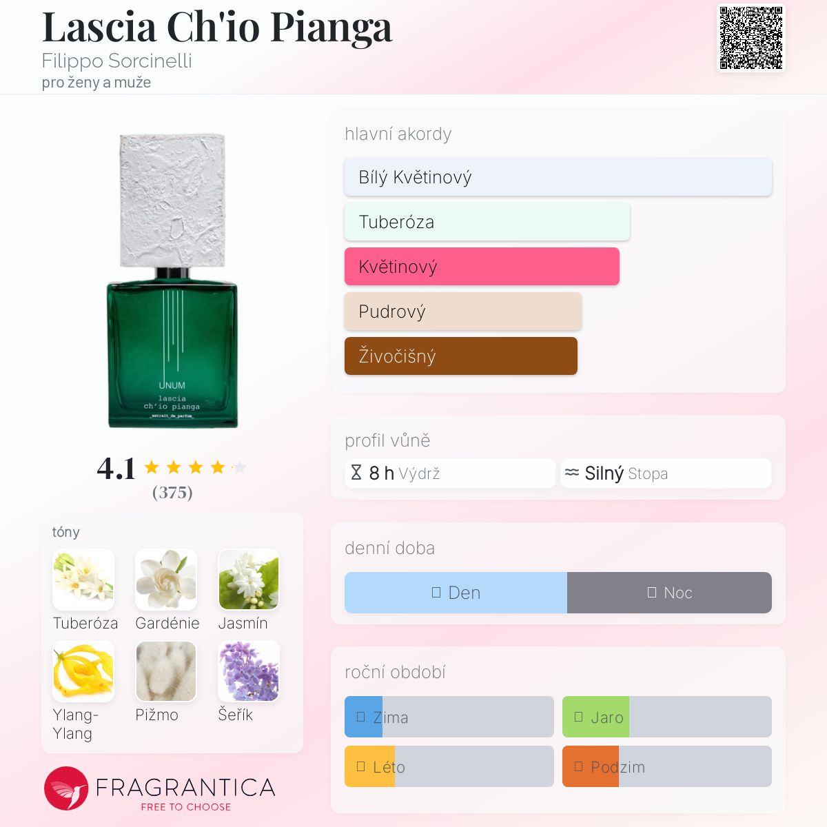 Lascia Ch'io Pianga podle Filippo Sorcinelli je Floral Green vůně pro ženy a muže. Lascia Ch'io Pianga byl/a uveden/a v roce 2022. "Nosem" za touto vůní je Filippo Sorcinelli. Vrchní tóny jsou Gardénie, Jasmín, Ylang-Ylang, Šeřík a Kosatec; střední tóny jsouTuberóza a Karafiát ; základní tóny jsou Pižmo a Balzám Tolu.
