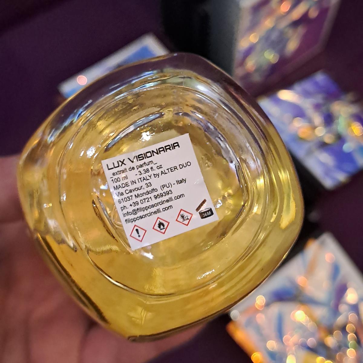 Lux Visionaria podle Filippo Sorcinelli je vůně pro ženy a muže. Lux Visionaria byl/a uveden/a v roce 2022. "Nosem" za touto vůní je Filippo Sorcinelli. Vrchní tóny jsou Myrha, Kadidlo, Vanilka, Pačuli, Jantar (ambra) a Šafrán; střední tóny jsouVzácné dřevo, Ambrette (přírodní pižmo), Jasmín a Konvalinka ; základní tóny jsou Kouř, Pelyněk a Ylang-Ylang.