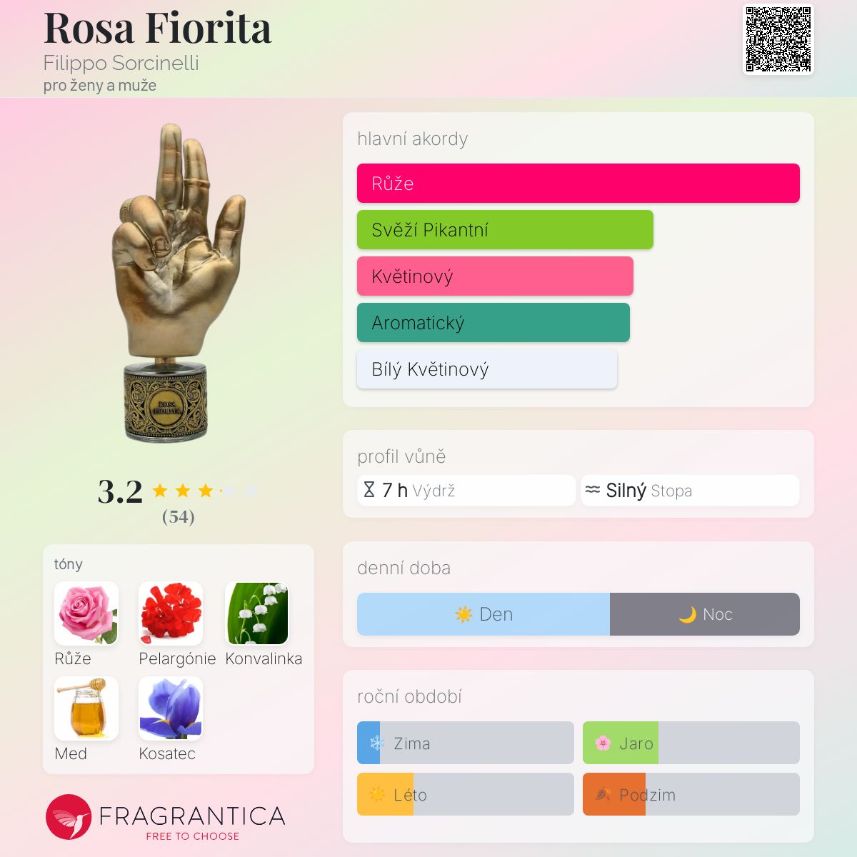 Rosa Fiorita podle Filippo Sorcinelli je Floral vůně pro ženy a muže. Rosa Fiorita byl/a uveden/a v roce 2024. "Nosem" za touto vůní je Filippo Sorcinelli. Vrchní tón je Pelargónie ; střední tóny jsouRůže májová, Konvalinka a Kosatec ; základní tóny jsou Damašská růže a Med.
