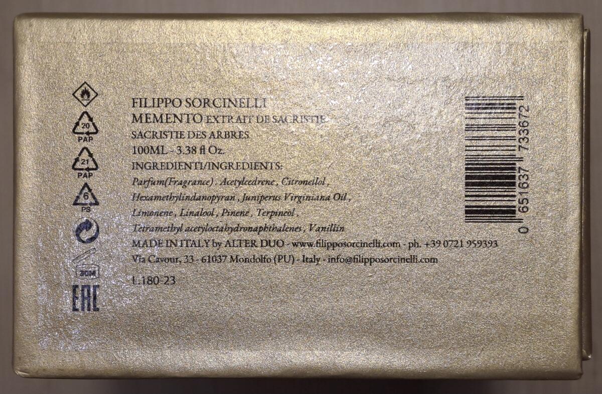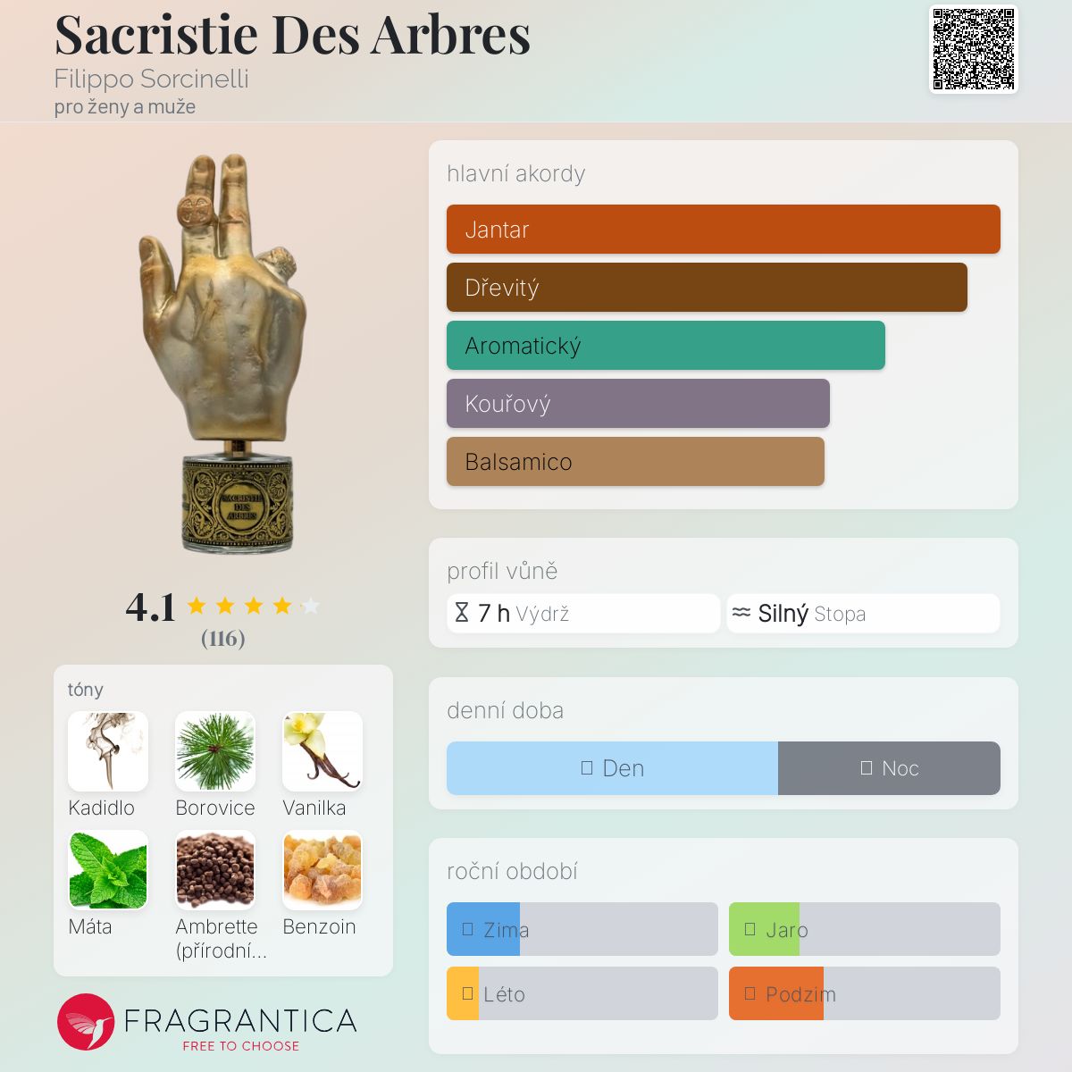 Sacristie Des Arbres podle Filippo Sorcinelli je Orientální Woody vůně pro ženy a muže. Toto je nová vůně. Sacristie Des Arbres byl/a uveden/a v roce 2024. "Nosem" za touto vůní je Filippo Sorcinelli. Vrchní tóny jsou Kadidlo, Borovice, Máta a Virginský cedr; střední tóny jsouGuajakové dřevo a Damašská růže ; základní tóny jsou Kadidlo, Vanilka, Ambrette (přírodní pižmo), Benzoin, Jantar (ambra) a Vetiver.