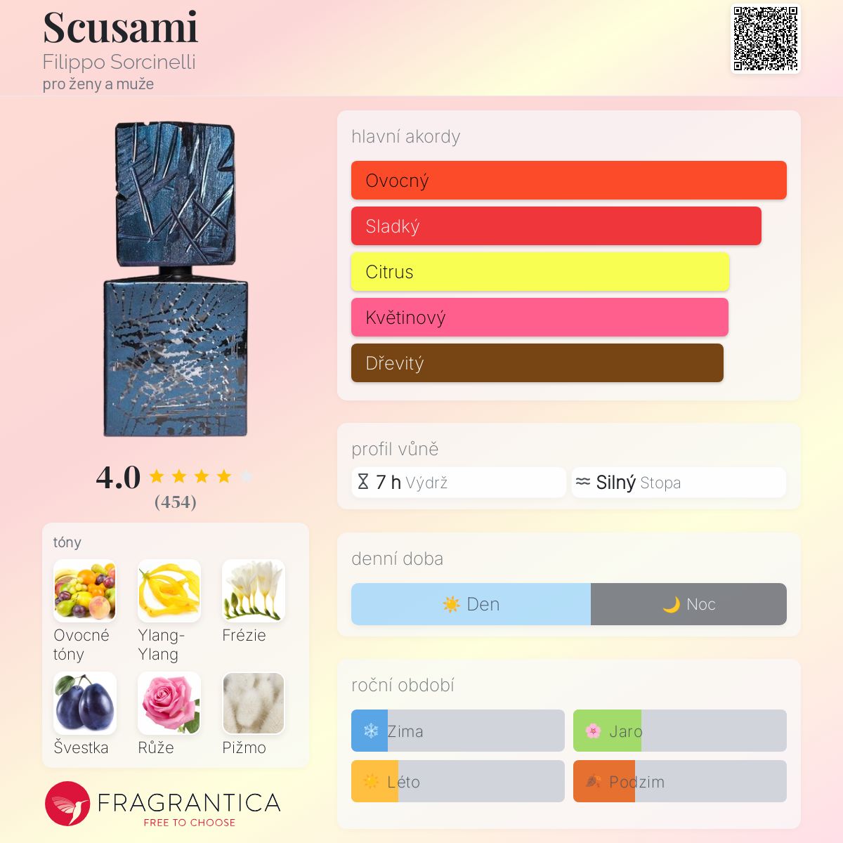 Scusami podle Filippo Sorcinelli je Orientální Floral vůně pro ženy a muže. Scusami byl/a uveden/a v roce 2020. Vrchní tóny jsou Ovocné tóny, Pižmo, Jantar (ambra), Ambrette (přírodní pižmo), Cedr, Santalové dřevo a Pačuli; střední tóny jsouYlang-Ylang, Frézie, Růže, Cukr, Černý rybíz a Konvalinka ; základní tóny jsou Švestka mirabelka, Citrón, Grapefruit, Bergamot a Otočník.