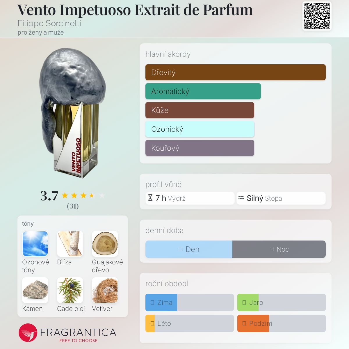 Vento Impetuoso Extrait de Parfum podle Filippo Sorcinelli je Woody vůně pro ženy a muže. Toto je nová vůně. Vento Impetuoso Extrait de Parfum byl/a uveden/a v roce 2025. "Nosem" za touto vůní je Filippo Sorcinelli. Vrchní tóny jsou Ozonové tóny, Cade olej a Styrax; střední tóny jsouBříza, Kámen a Kašmír ; základní tóny jsou Guajakové dřevo, Vetiver a Cypriolový olej.