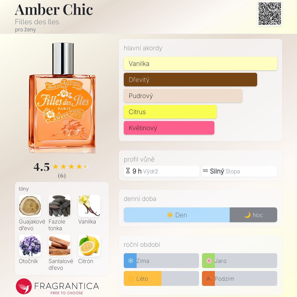 Amber Chic podle Filles des Iles je Orientální Floral vůně pro ženy. Amber Chic byl/a uveden/a v roce 2011. "Nosem" za touto vůní je Delphine Lebeau. Vrchní tóny jsou Citron amalfi a Vodní tóny; střední tóny jsouGuajakové dřevo, Otočník a Plumérie ; základní tóny jsou Fazole tonka, Vanilka a Santalové dřevo.