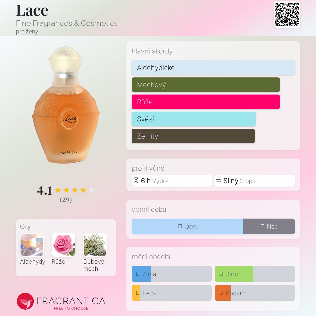 Lace podle Fine Fragrances & Cosmetics je Floral Aldehyde vůně pro ženy. Lace byl/a uveden/a v roce 1982. "Nosem" za touto vůní je Dominique Ropion.