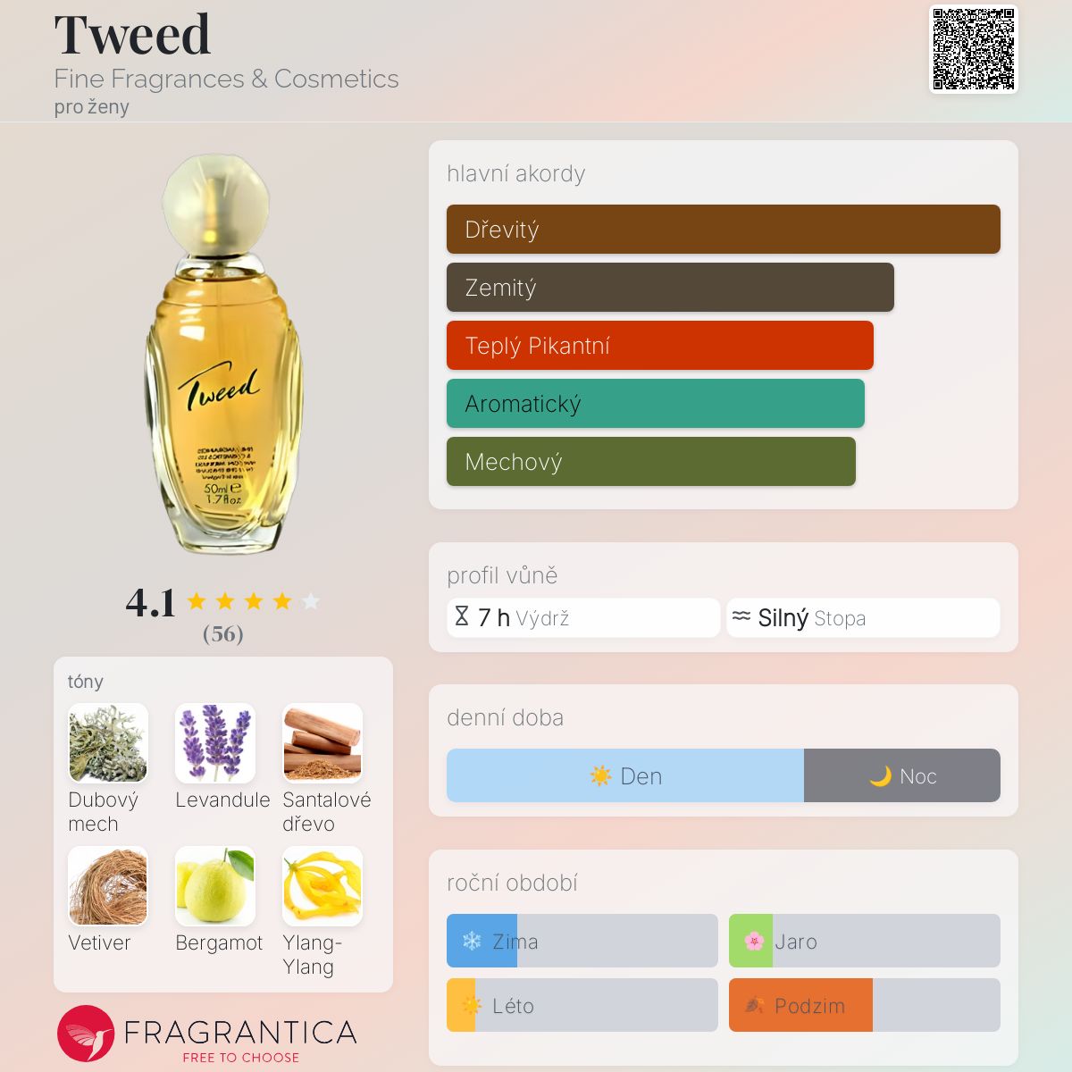 Tweed podle Fine Fragrances & Cosmetics je Floral Woody Musk vůně pro ženy. Tweed byl/a uveden/a v roce 1936. Vrchní tóny jsou Bergamot, Skořice a Pelargónie; střední tóny jsouLevandule, Ylang-Ylang, Jasmín a Pomerančový květ ; základní tóny jsou Dubový mech, Santalové dřevo, Vetiver, Benzoin, Pačuli a Vanilka.