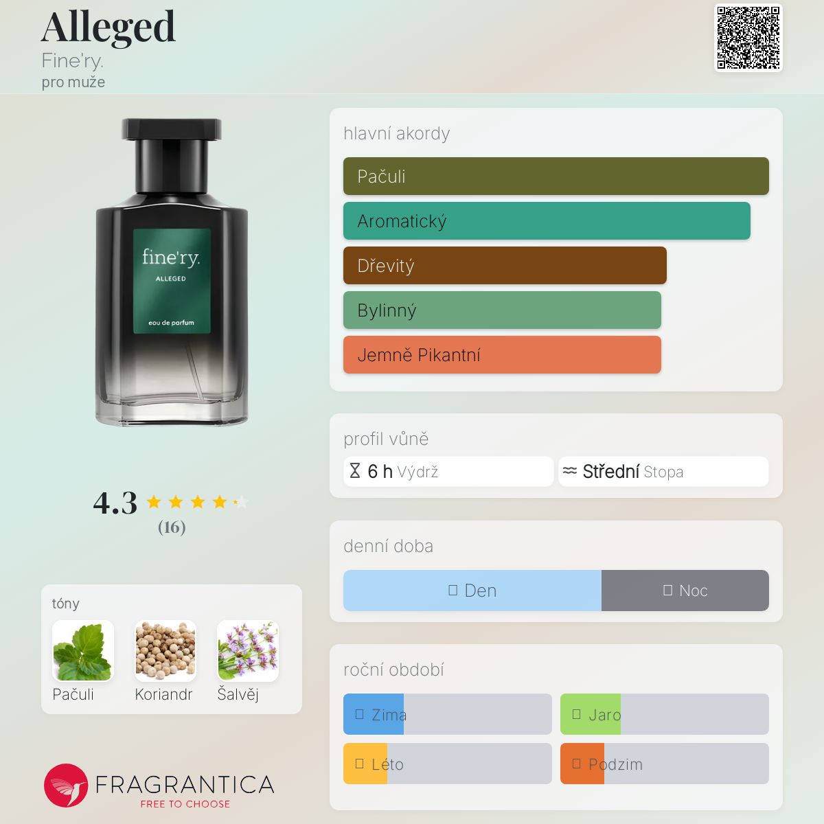 Alleged podle Fine'ry. je Aromatic vůně pro muže. Toto je nová vůně. Alleged byl/a uveden/a v roce 2024.