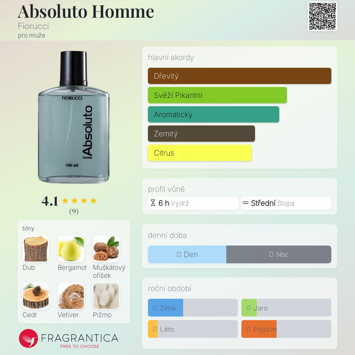 Absoluto Homme podle Fiorucci je Woody vůně pro muže. Absoluto Homme byl/a uveden/a v roce 2019. Vrchní tóny jsou Bergamot, Muškátový oříšek, Pepř a Kardamom; střední tóny jsouCedr, Jasmín, Levandule a Pačuli ; základní tóny jsou Dub, Vetiver, Pižmo a Jantar (ambra).