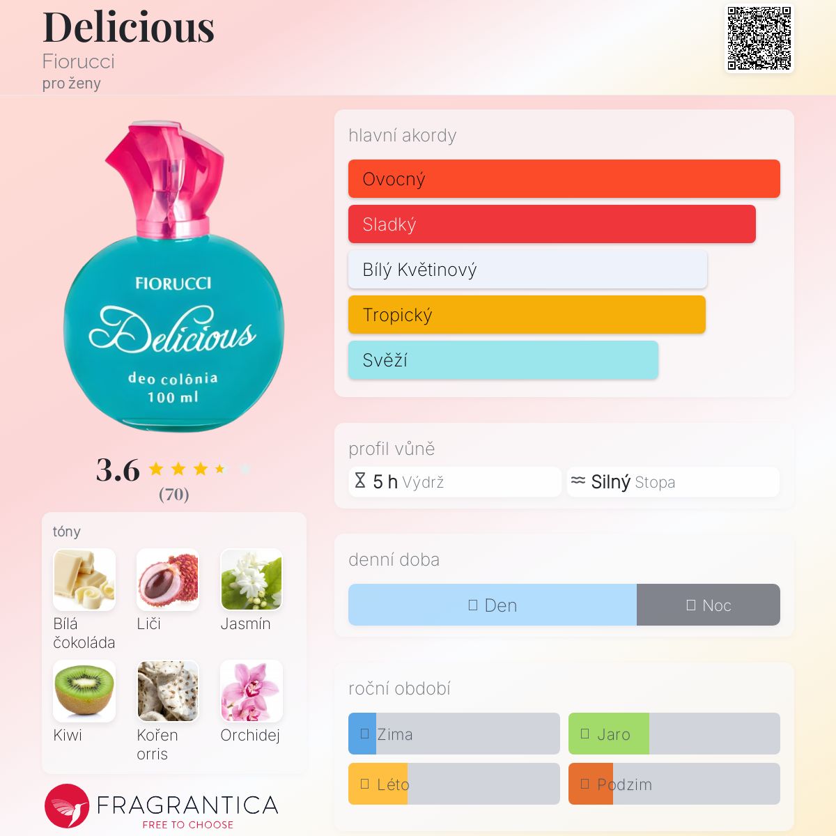 Delicious podle Fiorucci je Floral Fruity vůně pro ženy. Delicious byl/a uveden/a v roce 2012. Vrchní tóny jsou Červené liči a Kiwi; střední tóny jsouBílá čokoláda, Jasmín a Orchidej ; základní tóny jsou Kořen orris, Dřevité tóny a Pižmo.