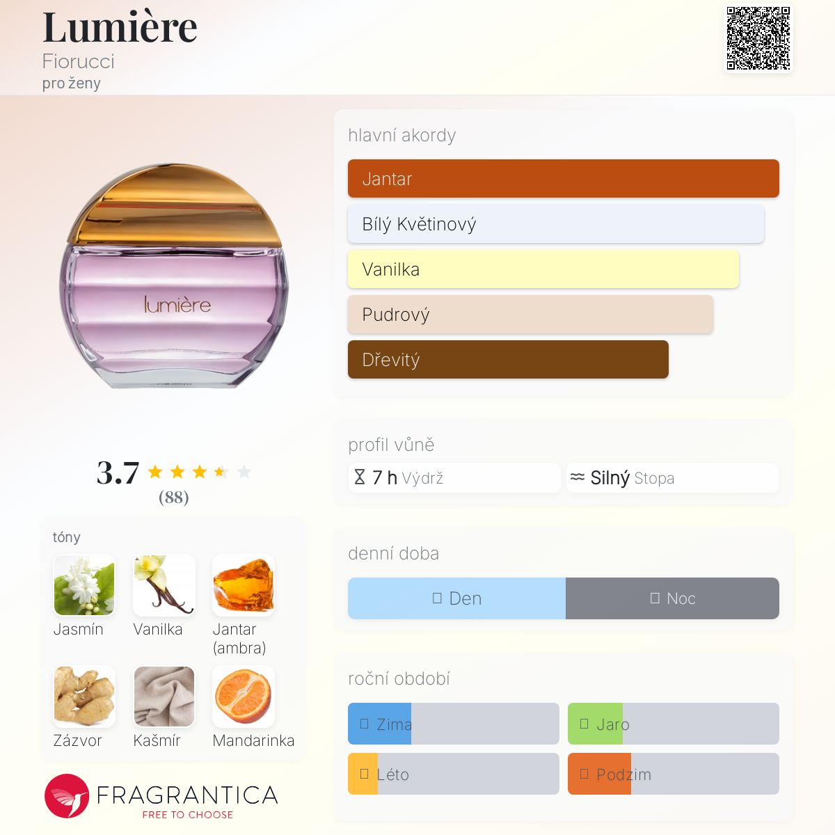 Lumière podle Fiorucci je Orientální Floral vůně pro ženy. Lumière byl/a uveden/a v roce 2017. Vrchní tóny jsou Vodní jasmín, Květ zázvoru a Mandarinka; střední tón jeVanilka ; základní tóny jsou Jantar (ambra), Kašmír a Santalové dřevo.