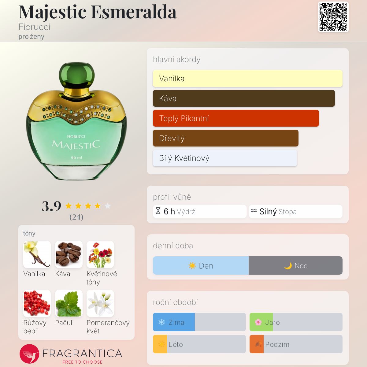 Majestic Esmeralda podle Fiorucci je Orientální Floral vůně pro ženy. Majestic Esmeralda byl/a uveden/a v roce 2019. Vrchní tóny jsou Růžový pepř, Mandarinka a Hruška; střední tóny jsouKvětinové tóny, Pomerančový květ a Jasmín ; základní tóny jsou Vanilka, Káva, Pačuli a Cedr.