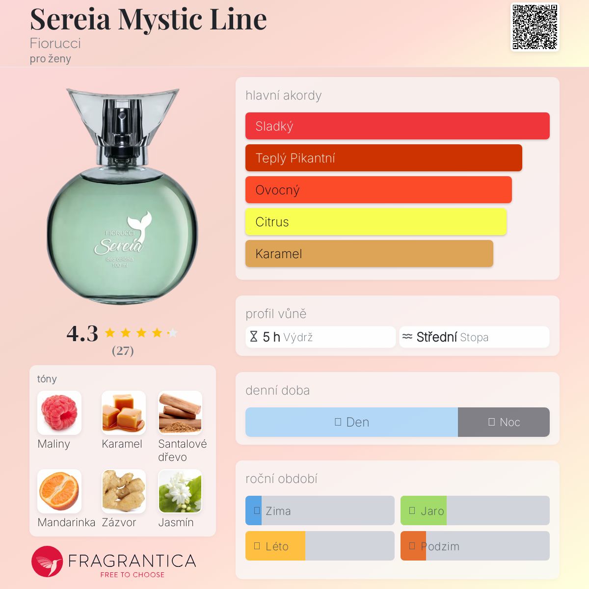 Sereia Mystic Line podle Fiorucci je Floral Fruity Gourmand vůně pro ženy. Sereia Mystic Line byl/a uveden/a v roce 2018. Vrchní tóny jsou Maliny, Mandarinka, Sicilský citron a Bergamot; střední tóny jsouKvět zázvoru, Jasmín, Gardénie, Růže a Kardamom ; základní tóny jsou Karamel, Santalové dřevo, Benzoin a Fazole tonka.