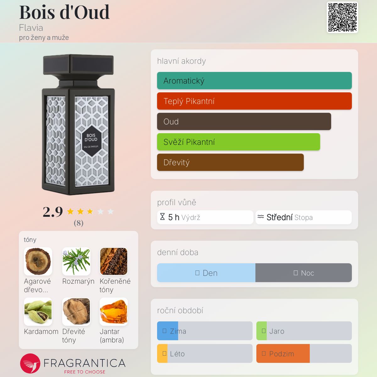 Bois d'Oud podle Flavia je vůně pro ženy a muže. Toto je nová vůně. Bois d'Oud byl/a uveden/a v roce 2024. Vrchní tóny jsou Rozmarýn, Kořeněné tóny a Kardamom; střední tóny jsouKořeněné tóny a Dřevité tóny ; základní tóny jsou Agarové dřevo (oud), Jantar (ambra) a Vanilka.