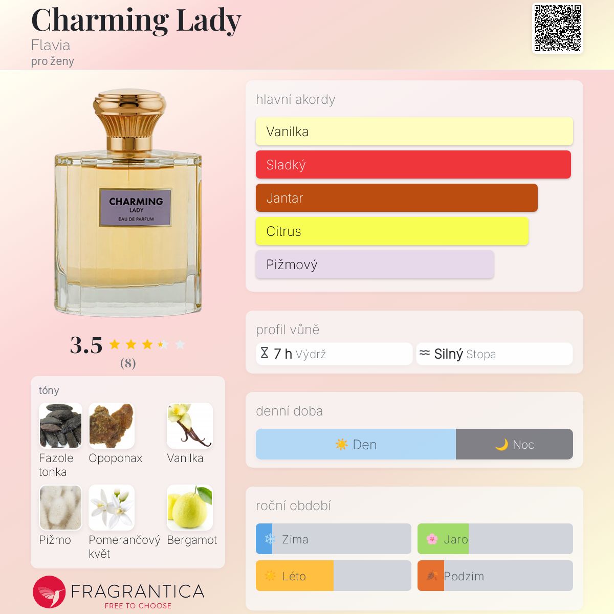 Charming Lady podle Flavia je vůně pro ženy. Charming Lady byl/a uveden/a v roce 2023. Vrchní tóny jsou Pomerančový květ, Bergamot, Pomeranč a Mandarinka; střední tóny jsouYlang-Ylang, Turecká růže a Jasmín ; základní tóny jsou Fazole tonka, Opoponax, Vanilka, Pižmo, Pačuli a Vetiver.