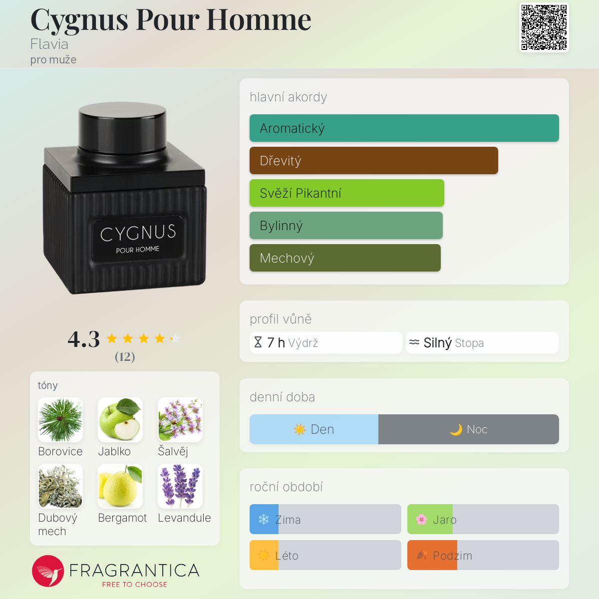 Cygnus Pour Homme podle Flavia je vůně pro muže. Vrchní tóny jsou Borovice, Jablko a Bergamot; střední tóny jsouŠalvěj, Levandule a Pelargónie ; základní tóny jsou Mech, Jantar (ambra) a Fazole tonka.