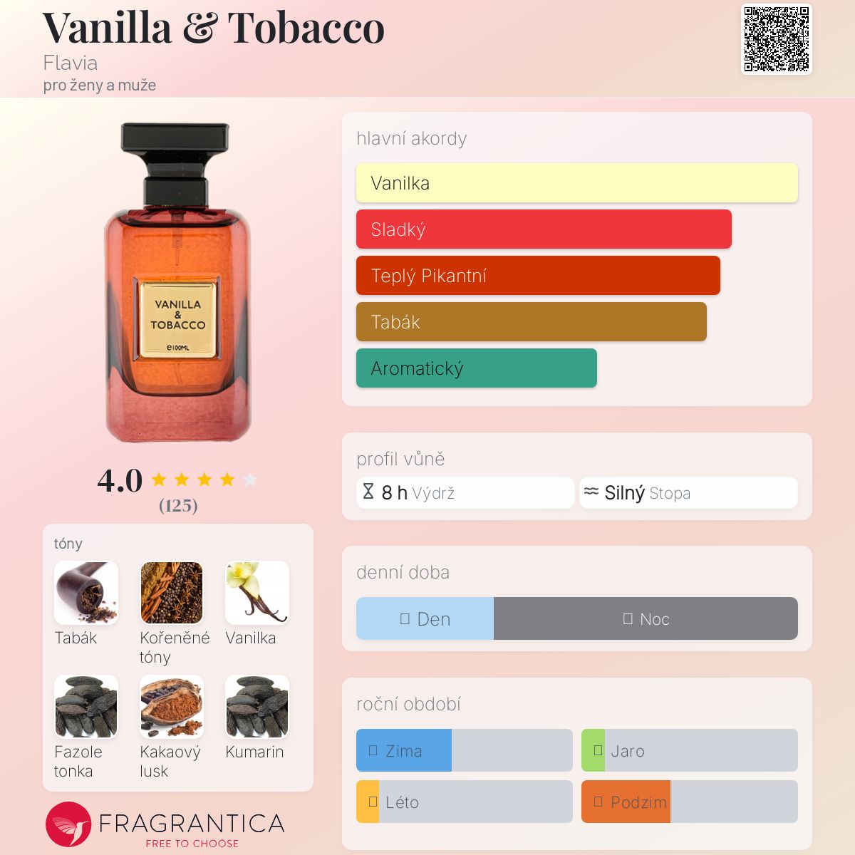 Vanilla & Tobacco podle Flavia je vůně pro ženy a muže. Vanilla & Tobacco byl/a uveden/a v roce 2023. Vrchní tóny jsou Kořeněné tóny a Tabák; střední tóny jsouVanilka, Fazole tonka a Kakao ; základní tóny jsou Kumarin a Dřevité tóny.