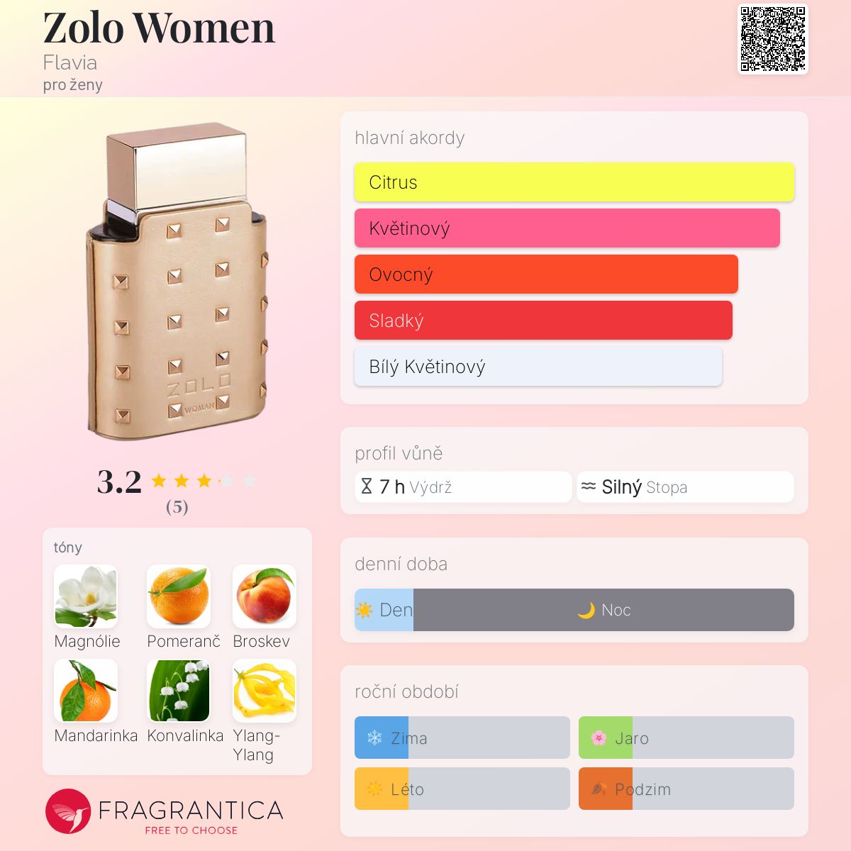Zolo Women podle Flavia je vůně pro ženy. Vrchní tóny jsou Magnólie, Pomeranč, Broskev a Mandarinka; střední tóny jsouKonvalinka, Ylang-Ylang, Karafiát, Tuberóza a Růže ; základní tóny jsou Ostružina, Pačuli, Vanilka a Pižmo.