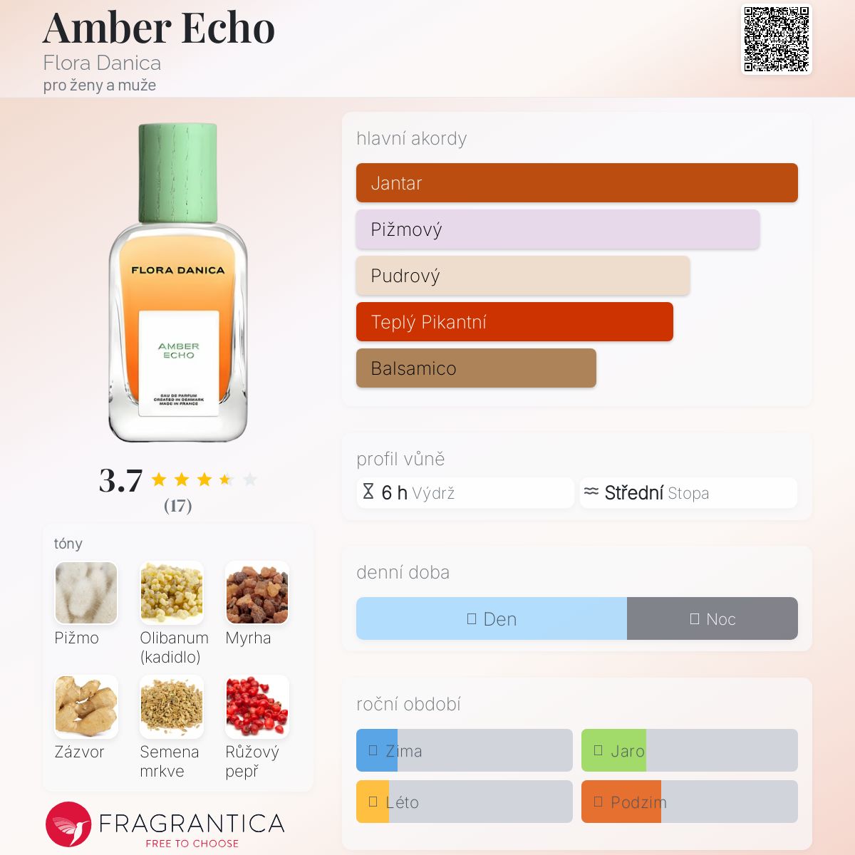 Amber Echo podle Flora Danica je Orientální vůně pro ženy a muže. Toto je nová vůně. Amber Echo byl/a uveden/a v roce 2024. Vrchní tóny jsou Zázvor, Růžový pepř a Sůl; střední tóny jsouSemena mrkve, Andělika a Jasmín ; základní tóny jsou Pižmo, Olibanum a Myrha.