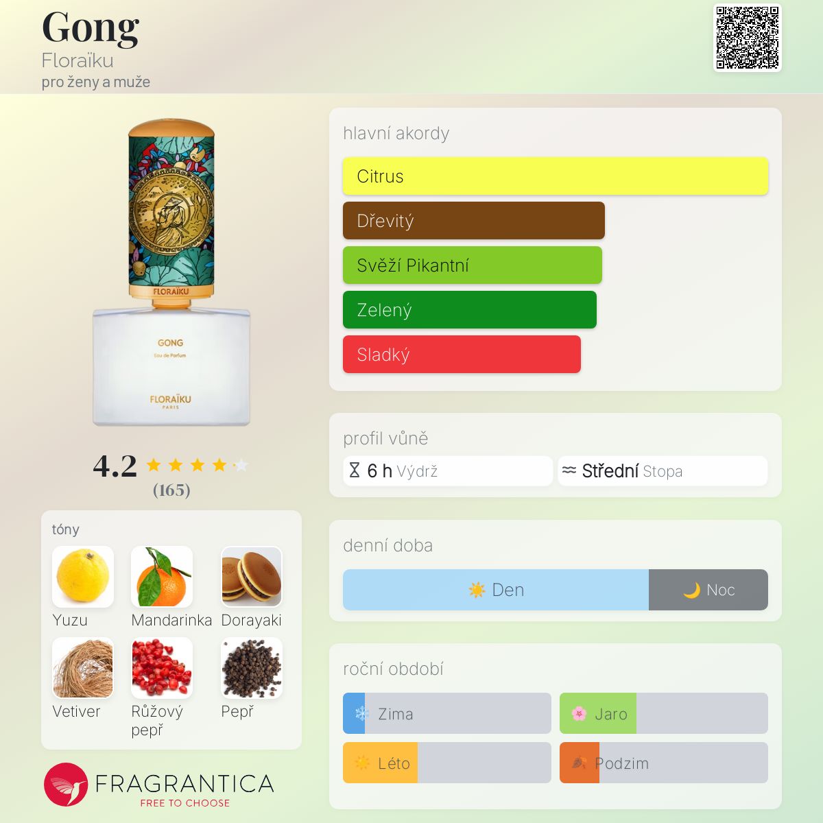 Gong podle Floraïku je Woody Spicy vůně pro ženy a muže. Toto je nová vůně. Gong byl/a uveden/a v roce 2025. Vrchní tóny jsou Yuzu, Italská mandarinka a Růžový pepř; střední tóny jsouDorayaki, Černý pepř a Siamský (thajský) benzoin ; základní tóny jsou Vetiver, Santalové dřevo, Jantar (ambra) a Guajakové dřevo.