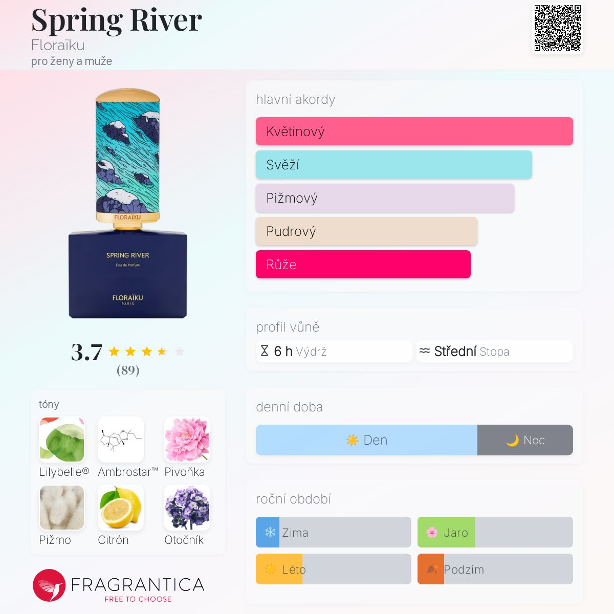 Spring River podle Floraïku je Floral Woody Musk vůně pro ženy a muže. Toto je nová vůně. Spring River byl/a uveden/a v roce 2024. Vrchní tóny jsou Pivoňka, Citrón a Petitgrain; střední tóny jsouLilybelle®, Otočník a Ylang-Ylang ; základní tóny jsou Ambrostar™, Bílé pižmo, Vetiver, Santalové dřevo a Pačuli.