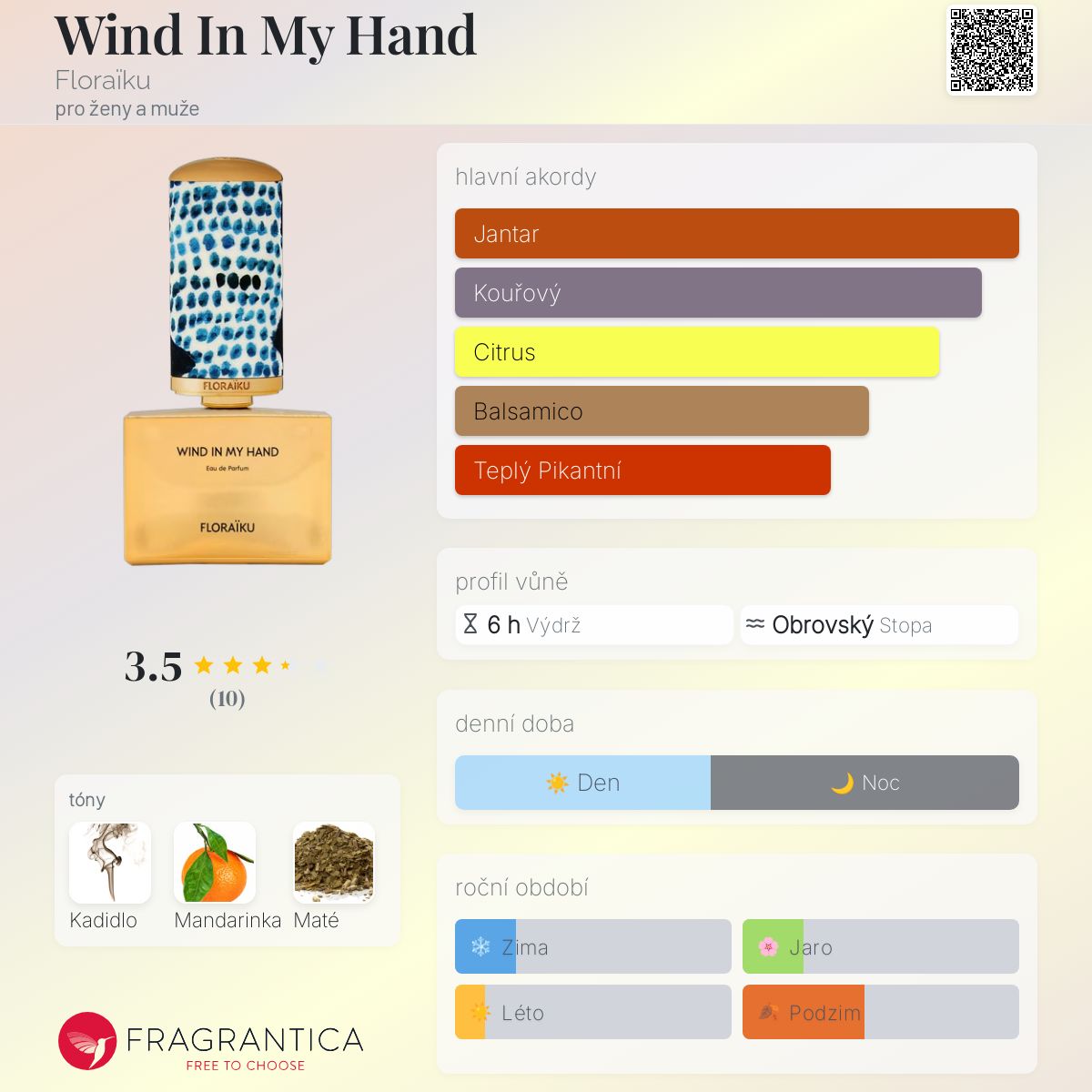 Wind In My Hand podle Floraïku je Citrus Aromatic vůně pro ženy a muže. Wind In My Hand byl/a uveden/a v roce 2018. Vrchní tón je Mandarinka ; střední tón jeMaté ; základní tón je Kadidlo.