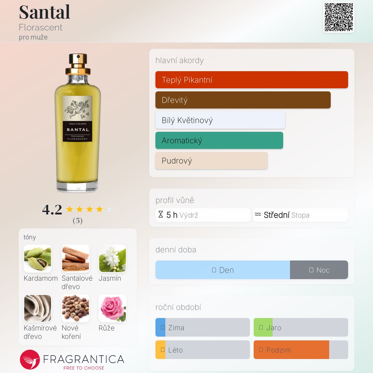 Santal podle Florascent je Orientální Spicy vůně pro muže. Vrchní tóny jsou Kardamom, Kašmírové dřevo a Nové koření; střední tóny jsouJasmín Sambac a Růže ; základní tón je Santalové dřevo.