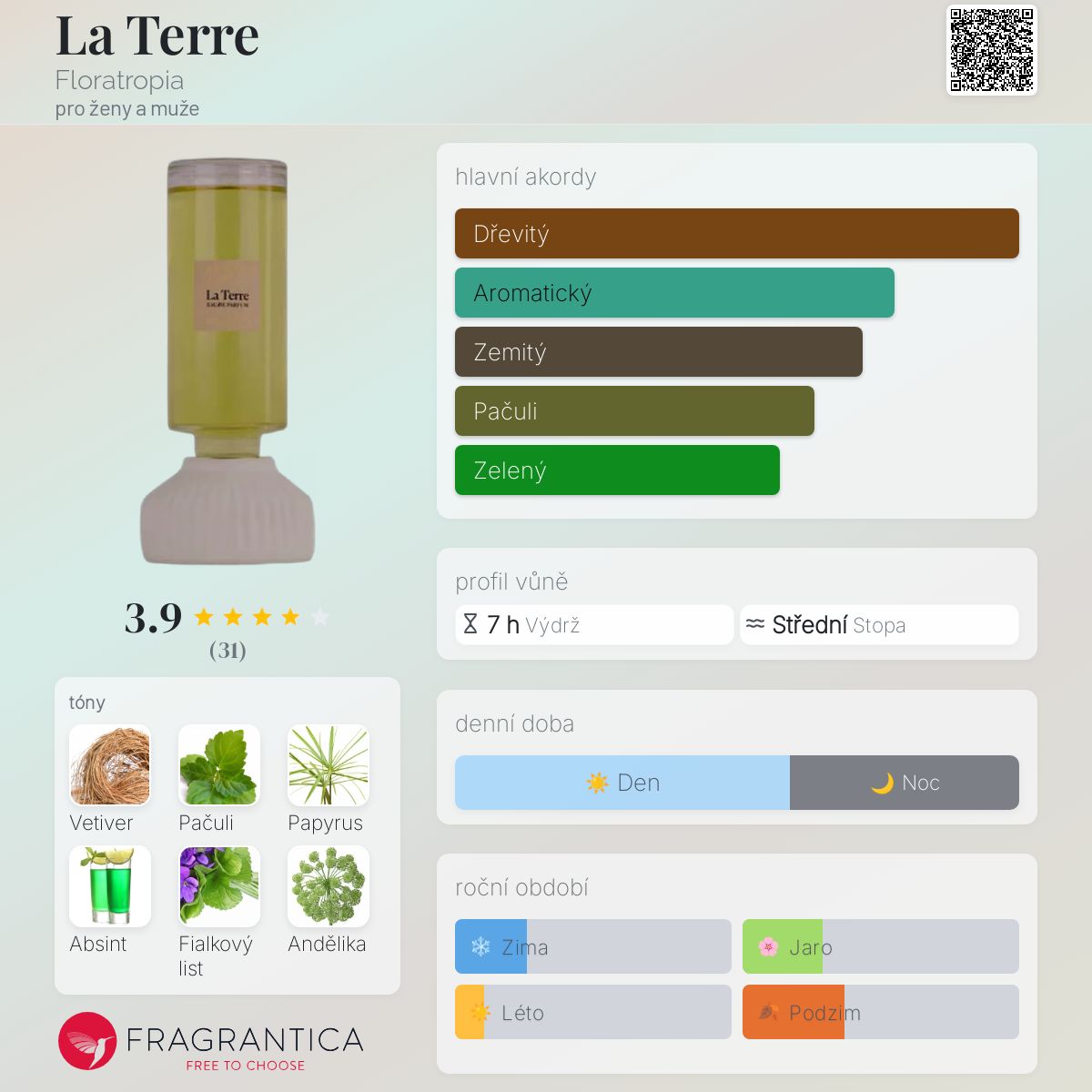 La Terre podle Floratropia je Chypre vůně pro ženy a muže. La Terre byl/a uveden/a v roce 2020. "Nosem" za touto vůní je Delphine Thierry. Vrchní tóny jsou Absint, Fialkový list a Andělika; střední tóny jsouKvět zázvoru a Narcis ; základní tóny jsou Haitský vetiver, Indické pačuli a Papyrus.