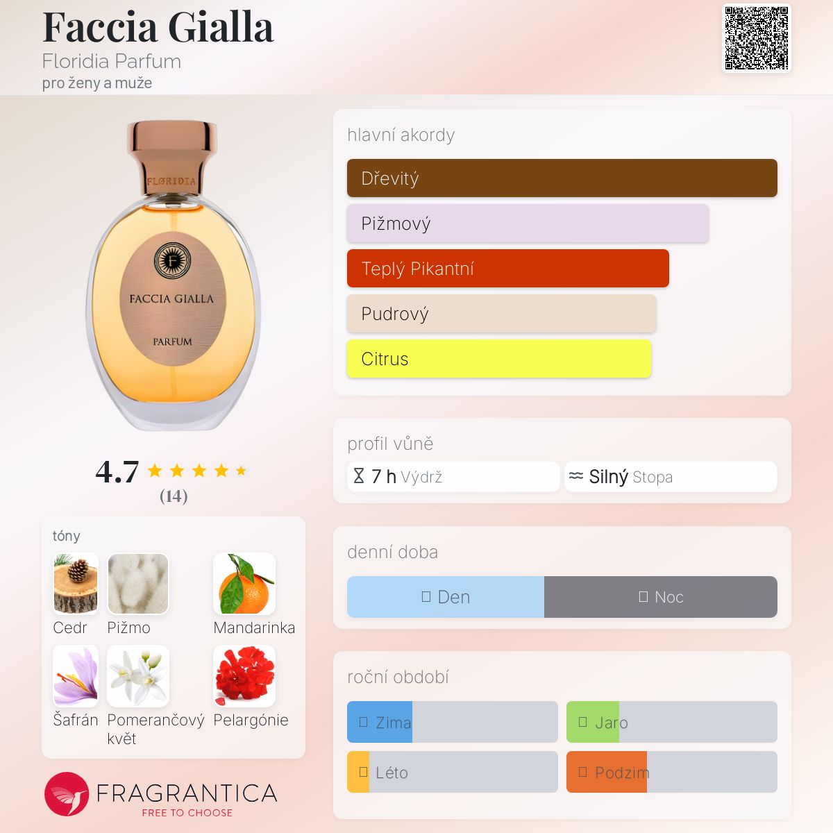 Faccia Gialla podle Floridia Parfum je Woody Spicy vůně pro ženy a muže. Toto je nová vůně. Faccia Gialla byl/a uveden/a v roce 2024. "Nosem" za touto vůní je Giovanni Festa. Vrchní tóny jsou Sicilská mandarinka, Pomerančový květ a Pelargónie; střední tóny jsouCedr, Šafrán, Černý rybíz, Santalové dřevo a Pačuli ; základní tóny jsou Pižmo a Ambroxan.