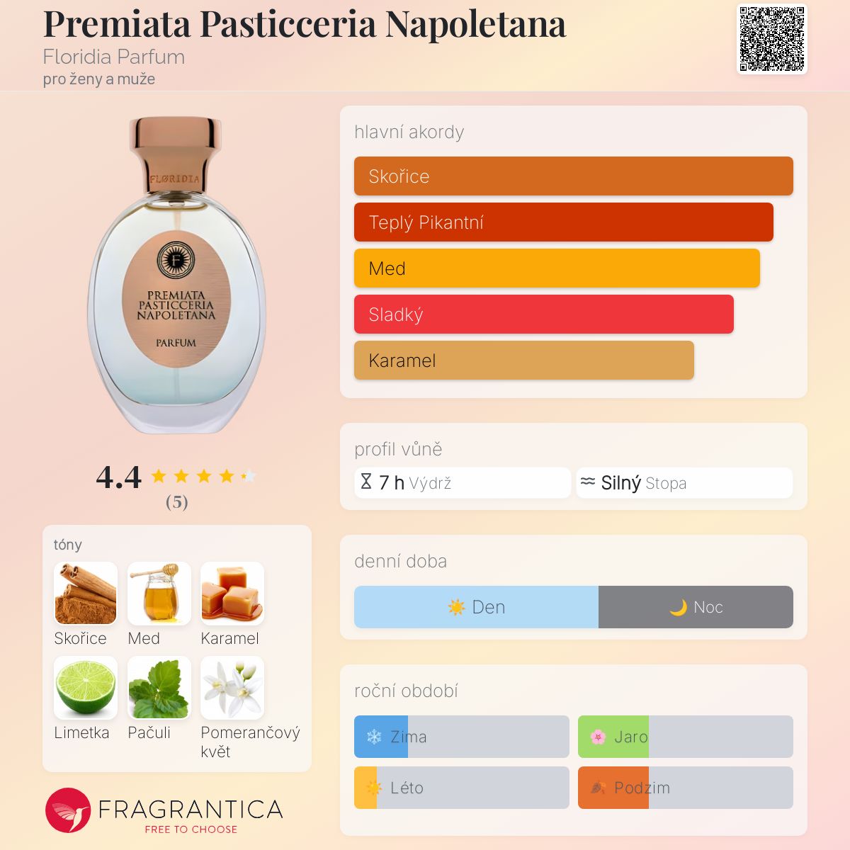Premiata Pasticceria Napoletana podle Floridia Parfum je Citrus Gourmand vůně pro ženy a muže. Toto je nová vůně. Premiata Pasticceria Napoletana byl/a uveden/a v roce 2024. "Nosem" za touto vůní je Giovanni Festa. Vrchní tóny jsou Med, Limetka a Pomerančový květ; střední tóny jsouSkořice a Karamel ; základní tóny jsou Pačuli a Kosatec.