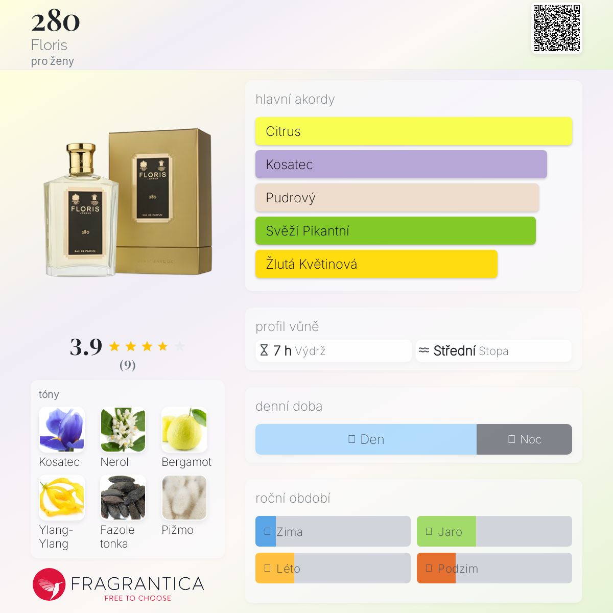 280 podle Floris je Orientální Floral vůně pro ženy. 280 byl/a uveden/a v roce 2010. Vrchní tóny jsou Bergamot, Hřebíček a Pepř; střední tóny jsouKosatec, Neroli a Ylang-Ylang ; základní tóny jsou Fazole tonka, Pižmo a Vanilka.