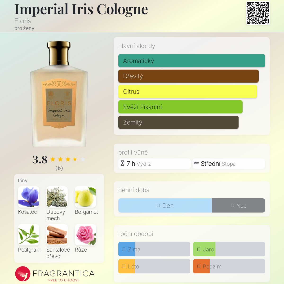 Imperial Iris Cologne podle Floris je Citrus Aromatic vůně pro ženy. Imperial Iris Cologne byl/a uveden/a v roce 2017. "Nosem" za touto vůní je Nicola Pozzani. Vrchní tóny jsou Bergamot, Mořské tóny, Černý rybíz a Levandule; střední tóny jsouPetitgrain, Růže, Neroli a Pelargónie ; základní tóny jsou Květ kosatce, Dubový mech, Santalové dřevo, Jantar (ambra) a Pižmo.