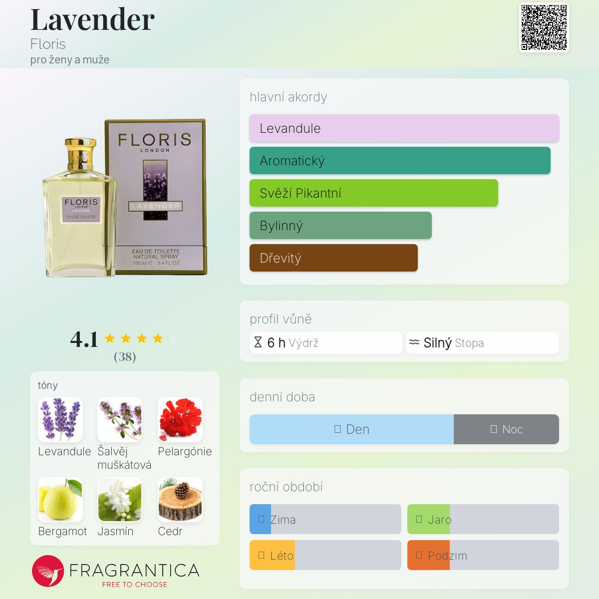 Lavender podle Floris je Aromatic vůně pro ženy a muže. Lavender byl/a uveden/a v roce 1821. Vrchní tóny jsou Šalvěj muškátová a Bergamot; střední tóny jsouLevandule, Pelargónie, Jasmín a Fialka ; základní tóny jsou Cedr a Vanilka.