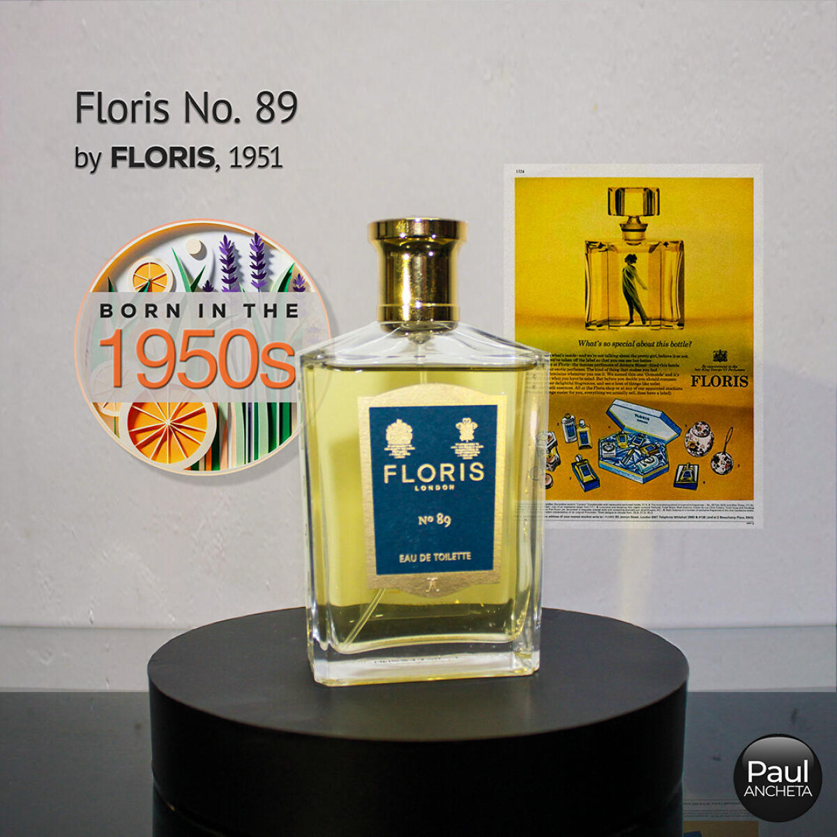 No 89 podle Floris je Woody Aromatic vůně pro muže. No 89 byl/a uveden/a v roce 1951. Vrchní tóny jsou Levandule, Bergamot, Pomeranč, Neroli, Petitgrain a Muškátový oříšek; střední tóny jsouRůže, Pelargónie a Ylang-Ylang ; základní tóny jsou Dubový mech, Pižmo, Santalové dřevo, Vetiver a Virginský cedr.