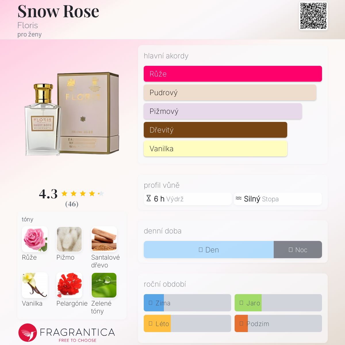 Snow Rose podle Floris je Orientální Floral vůně pro ženy. Snow Rose byl/a uveden/a v roce 2009. Vrchní tón je Zelené tóny ; střední tóny jsouRůže, Pelargónie a Jasmín ; základní tóny jsou Pižmo, Santalové dřevo a Vanilka.
