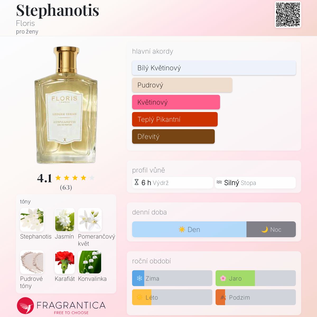 Stephanotis podle Floris je Floral vůně pro ženy. Stephanotis byl/a uveden/a v roce 1786. Vrchní tón je Pomerančový květ ; střední tóny jsouStephanotis, Jasmín, Karafiát, Konvalinka a Koriandr ; základní tóny jsou Pudrové tóny, Santalové dřevo a Pižmo.