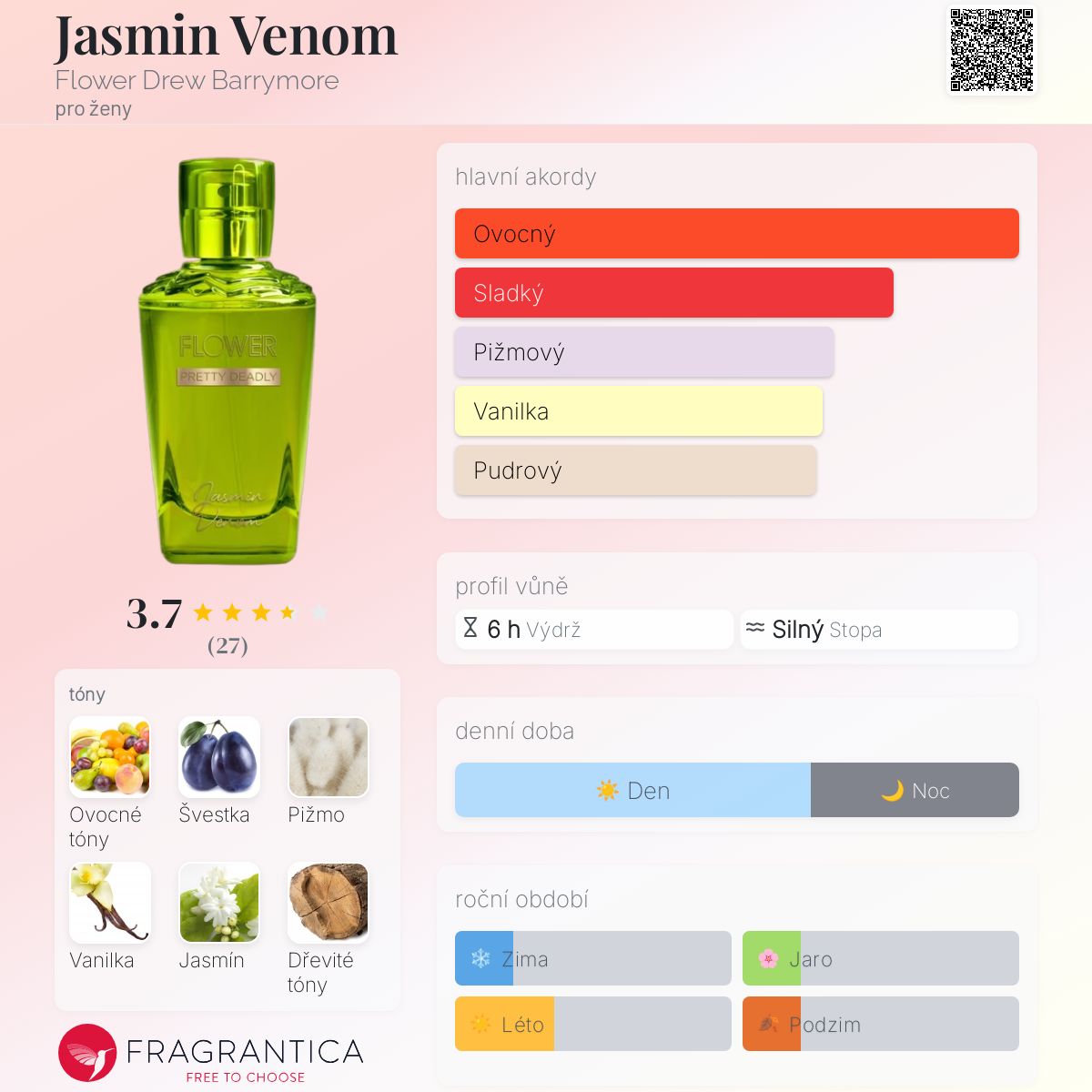 Jasmin Venom podle Flower Drew Barrymore je Floral Woody Musk vůně pro ženy. Jasmin Venom byl/a uveden/a v roce 2018. Vrchní tóny jsou Drobné ovoce a Švestka; střední tóny jsouVanilka a Jasmín ; základní tóny jsou Pižmo, Dřevité tóny a Jantar (ambra).
