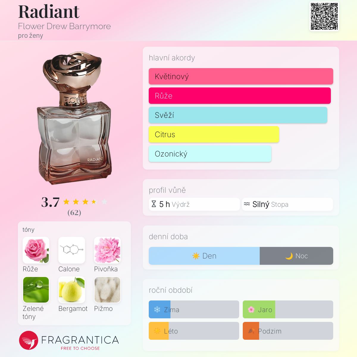 Radiant podle Flower Drew Barrymore je Floral Aquatic vůně pro ženy. Radiant byl/a uveden/a v roce 2014. "Nosem" za touto vůní je Stephen Nilsen. Vrchní tóny jsou Calone, Zelený tón a Bergamot; střední tóny jsouRůže, Růžová pivoňka a Magnólie ; základní tóny jsou Pižmo, Bílé dřevo a Jantar (ambra).