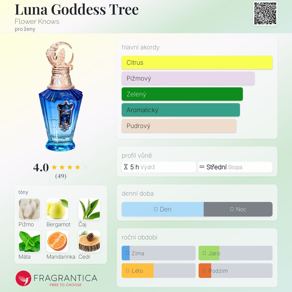 Luna Goddess Tree podle Flower Knows je Floral Green vůně pro ženy. Luna Goddess Tree byl/a uveden/a v roce 2023. Vrchní tóny jsou Bergamot, Máta a Mandarinka; střední tóny jsouČaj, Cedr a Mech ; základní tóny jsou Pižmo, Koriandr a Santalové dřevo.