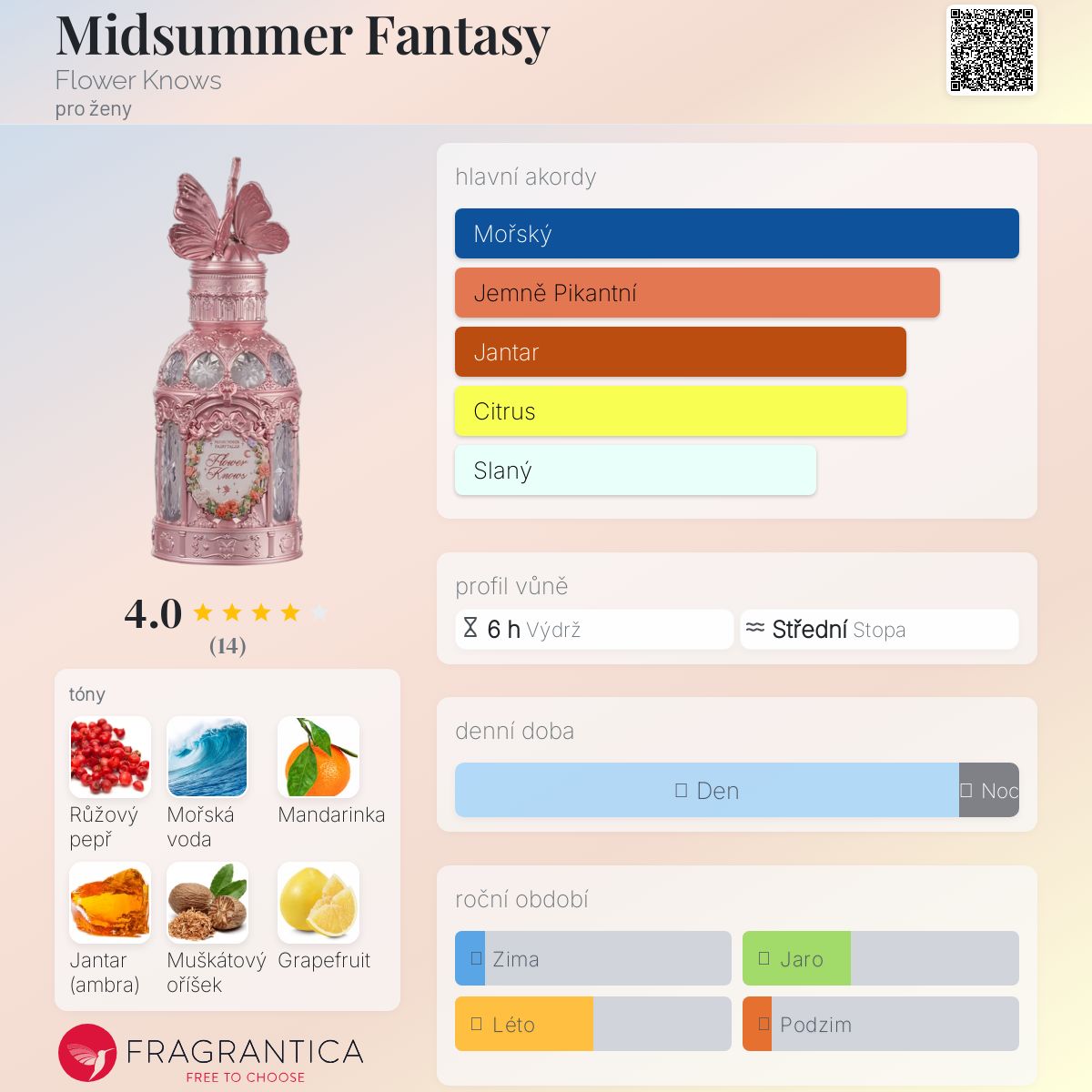 Midsummer Fantasy podle Flower Knows je Citrus Aromatic vůně pro ženy. Toto je nová vůně. Midsummer Fantasy byl/a uveden/a v roce 2024. Vrchní tóny jsou Růžový pepř, Mandarinka, Grapefruit a Yuzu; střední tóny jsouVodní tóny, Muškátový oříšek a Tymián ; základní tóny jsou Jantar (ambra), Pižmo a Vetiver.