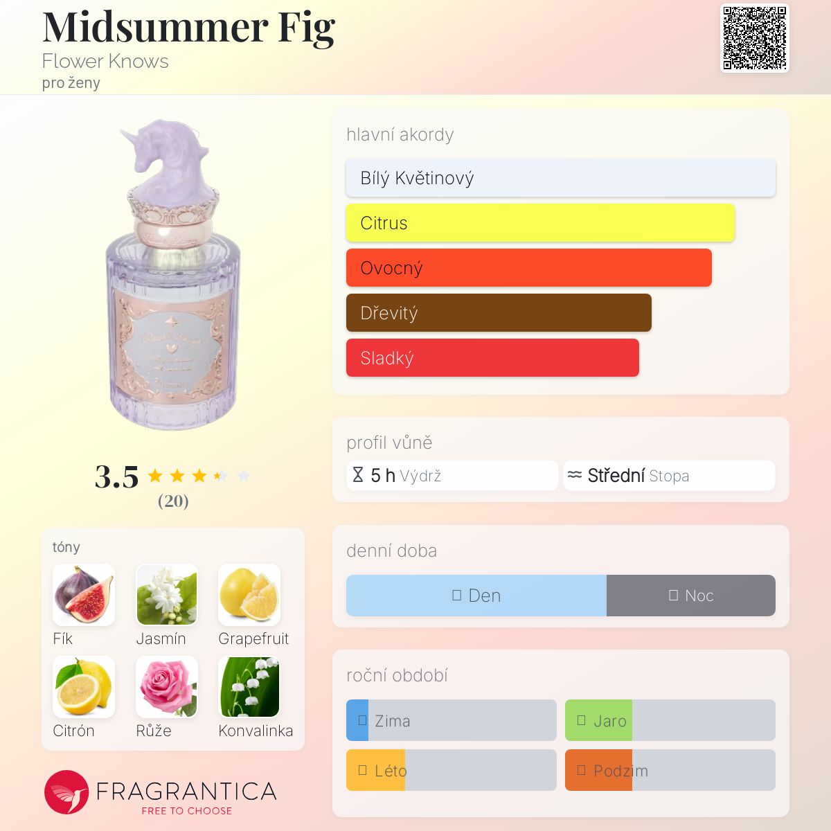 Midsummer Fig podle Flower Knows je Floral vůně pro ženy. Midsummer Fig byl/a uveden/a v roce 2023. Vrchní tóny jsou Fík, Grapefruit a Citrón; střední tóny jsouJasmín, Růže a Konvalinka ; základní tón je Cedr.