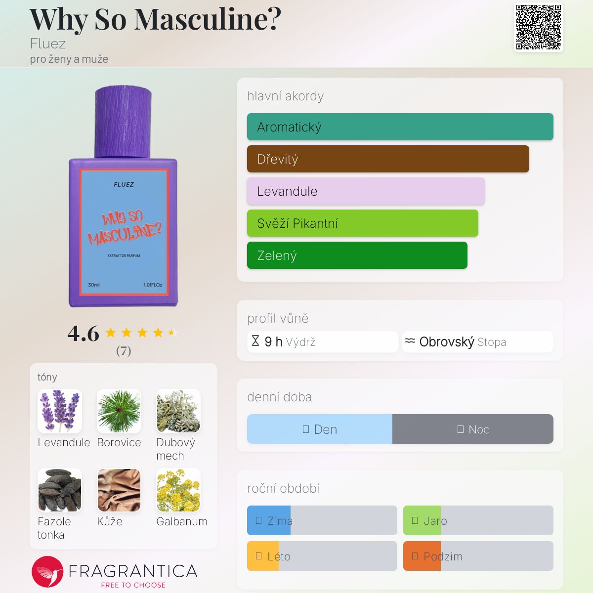 Why So Masculine? podle Fluez je Aromatic Fougere vůně pro ženy a muže. Toto je nová vůně. Why So Masculine? byl/a uveden/a v roce 2025. Vrchní tóny jsou Levandule, Galbanum a Muškátový oříšek; střední tóny jsouDubový mech, Fazole tonka a Heřmánek ; základní tóny jsou Borovice, Kůže a Pačuli.