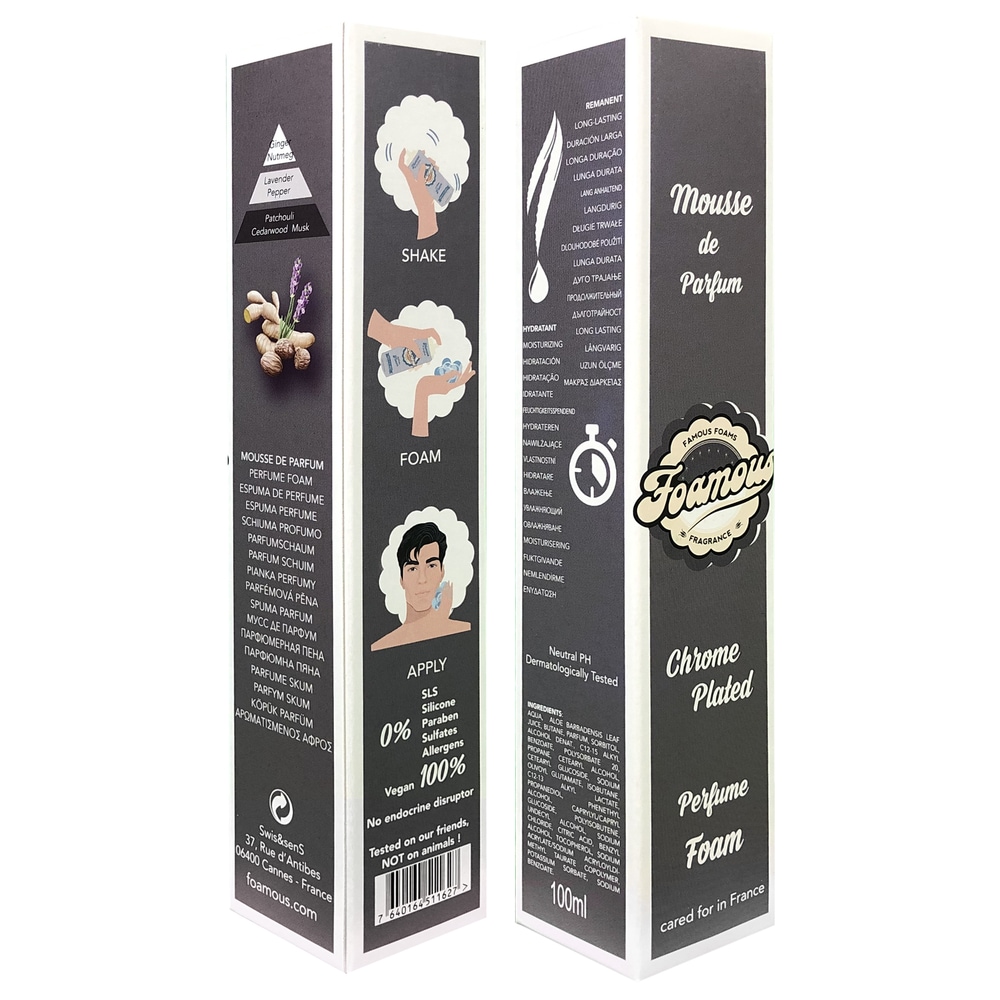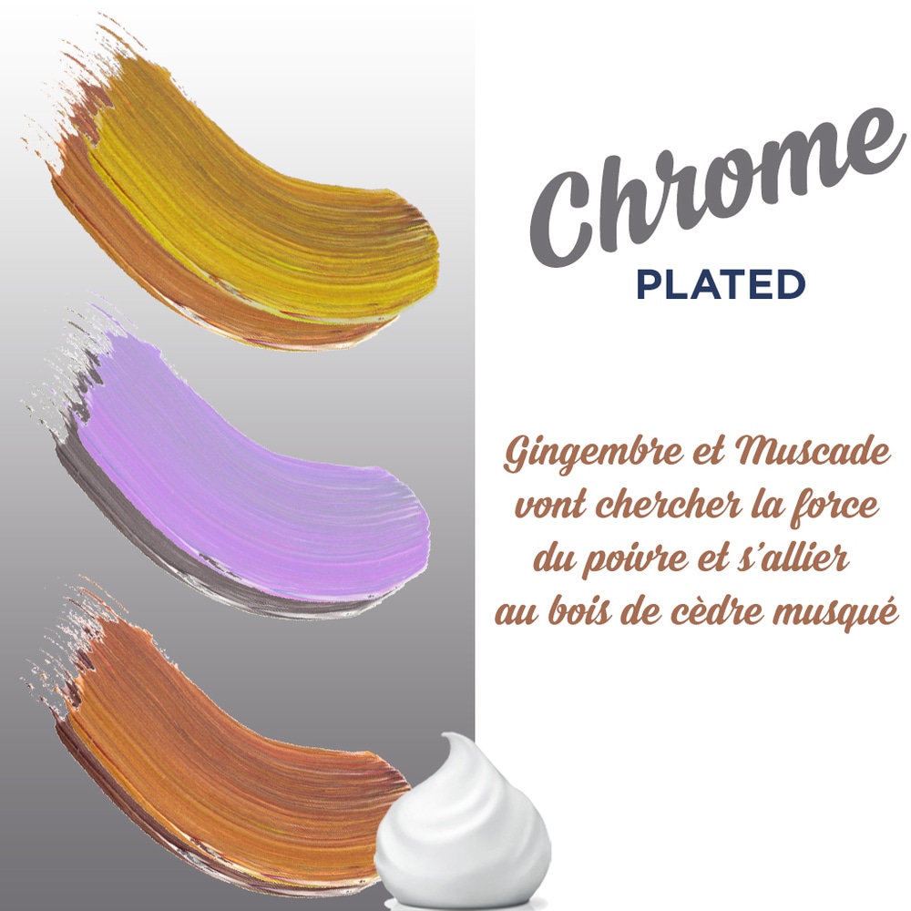 Chrome Plated podle Foamous je Woody Spicy vůně pro muže. Chrome Plated byl/a uveden/a v roce 2019. Vrchní tóny jsou Zázvor a Muškátový oříšek; střední tóny jsouPepř a Levandule ; základní tóny jsou Pačuli, Pižmo a Cedr.