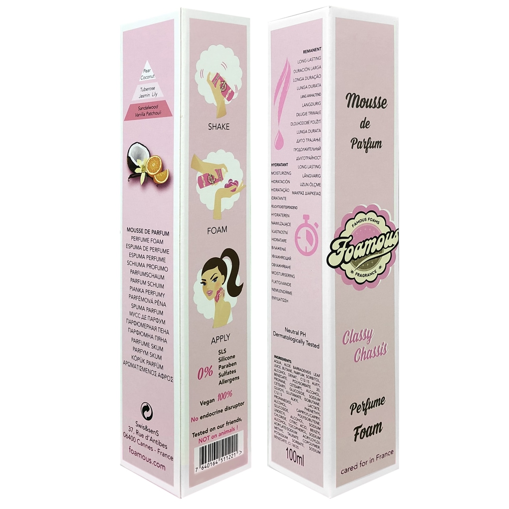 Classy Chassis podle Foamous je Orientální Floral vůně pro ženy. Classy Chassis byl/a uveden/a v roce 2019. Vrchní tóny jsou Kokos a Hruška; střední tóny jsouTuberóza, Jasmín a Lilie ; základní tóny jsou Santalové dřevo, Vanilka a Pačuli.