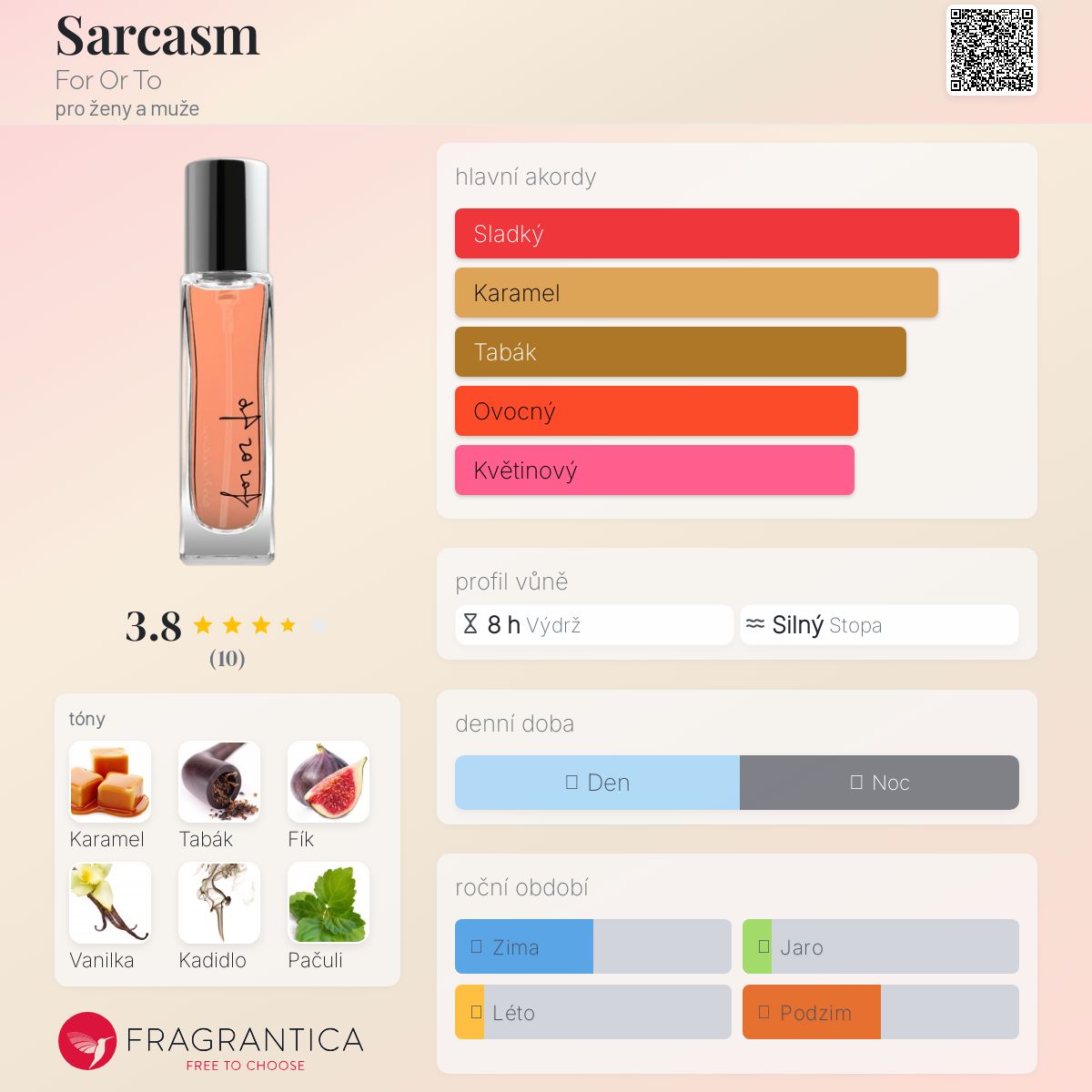 Sarcasm podle For Or To je Orientální vůně pro ženy a muže. Sarcasm byl/a uveden/a v roce 2017. "Nosem" za touto vůní je Oleg Razygrin.