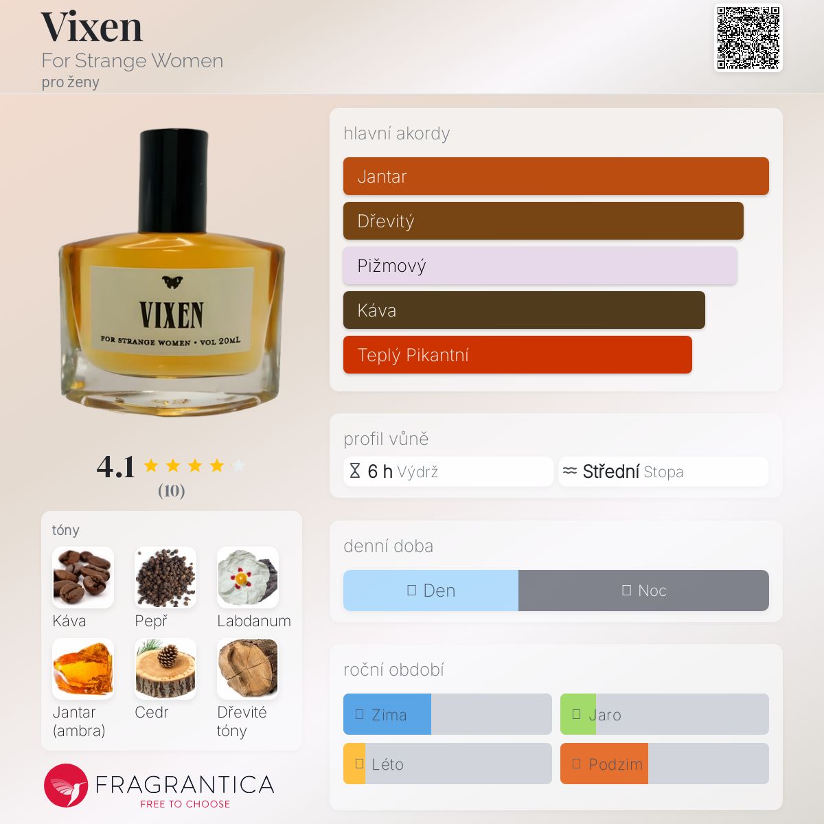 Vixen podle For Strange Women je vůně pro ženy. Vrchní tón je Cedr ; střední tóny jsouLabdanum a Jantar (ambra) ; základní tóny jsou Káva, Černý pepř, Dřevité tóny, Ambrette (přírodní pižmo) a Pižmo.