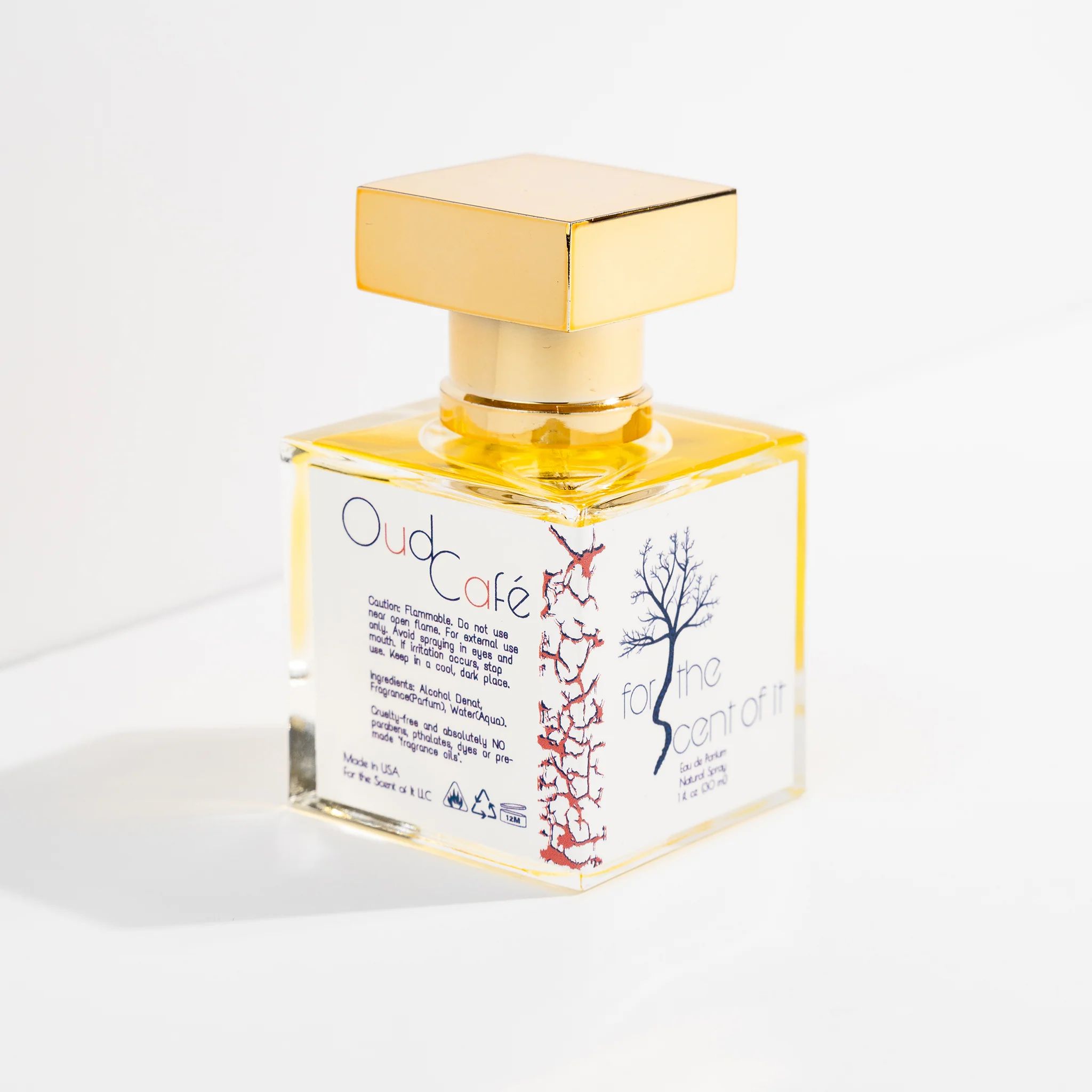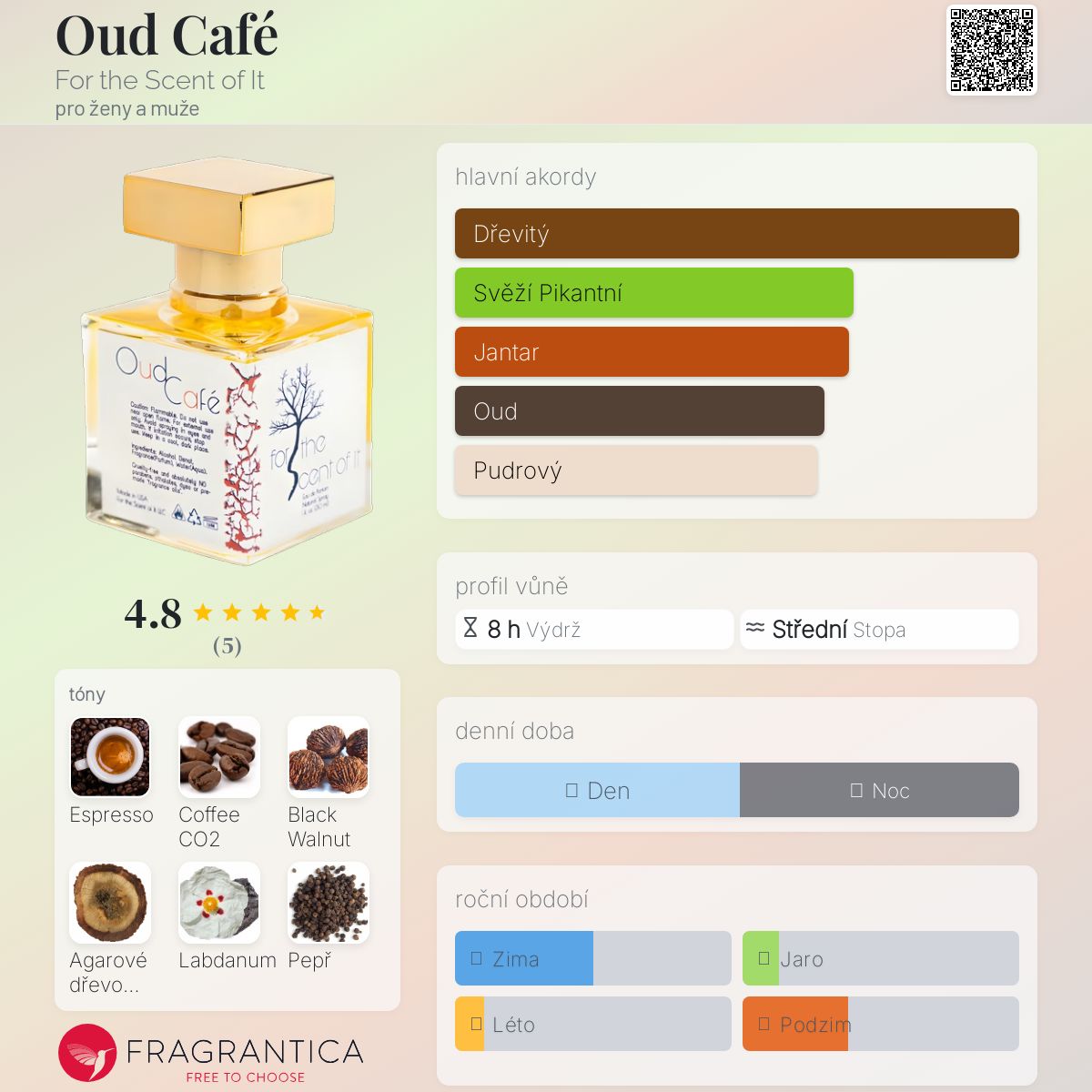 Oud Café podle For the Scent of It je Woody Aromatic vůně pro ženy a muže. Oud Café byl/a uveden/a v roce 2022. "Nosem" za touto vůní je Michael Schrammel. Vrchní tóny jsou Café Expresso, Černý ořech, Bílý pepř a Bergamot; střední tóny jsouKáva CO2, Agarové dřevo (oud), Kosatec, Dub a Bulharská růže ; základní tóny jsou Labdanum, Santalové dřevo, Vetiver, Fazole tonka a Pižmo.