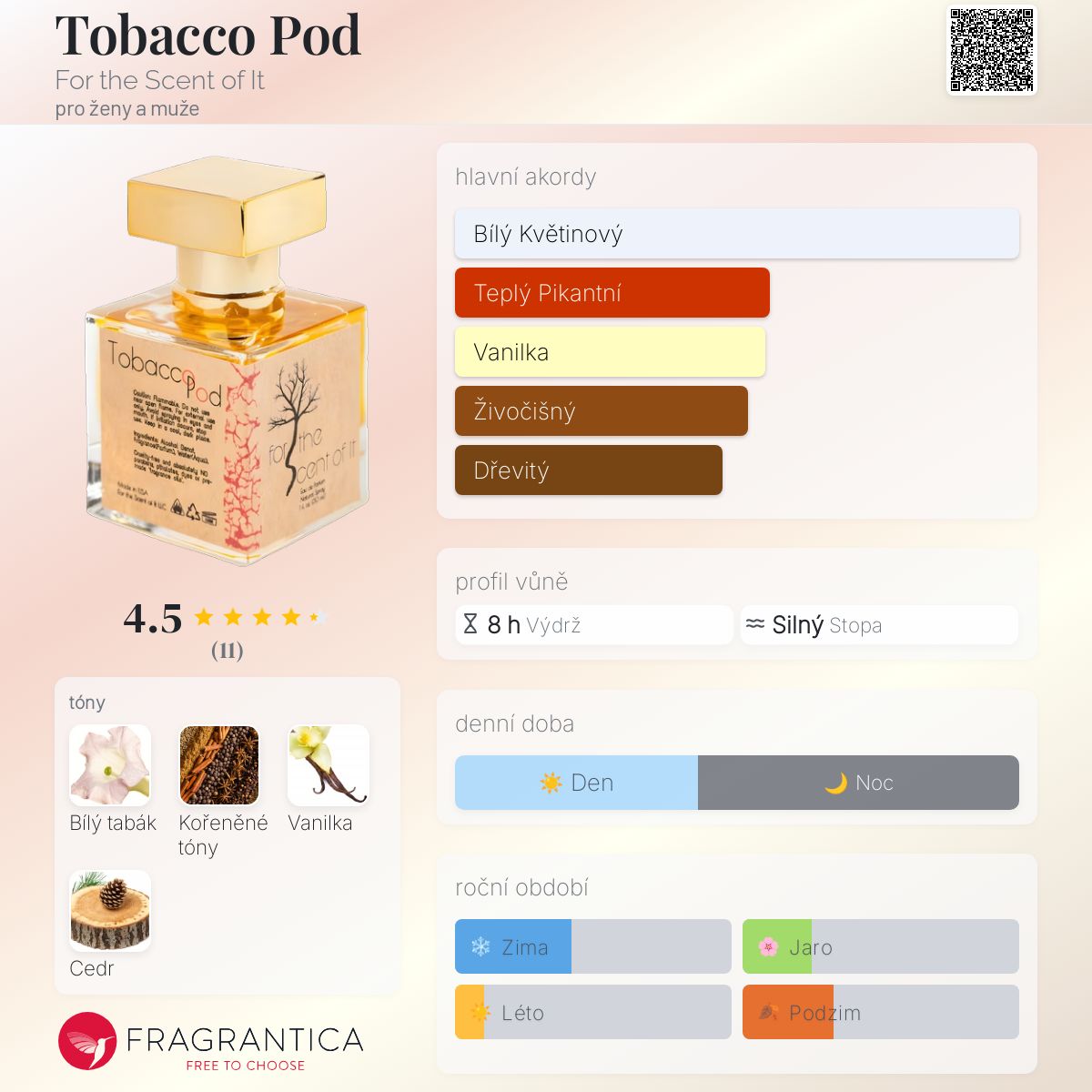 Tobacco Pod podle For the Scent of It je Aromatic vůně pro ženy a muže. Tobacco Pod byl/a uveden/a v roce 2021. "Nosem" za touto vůní je Michael Schrammel. Vrchní tón je Koření ; střední tón jeBulharský světlý tabák ; základní tóny jsou Vanilka a Cedr.