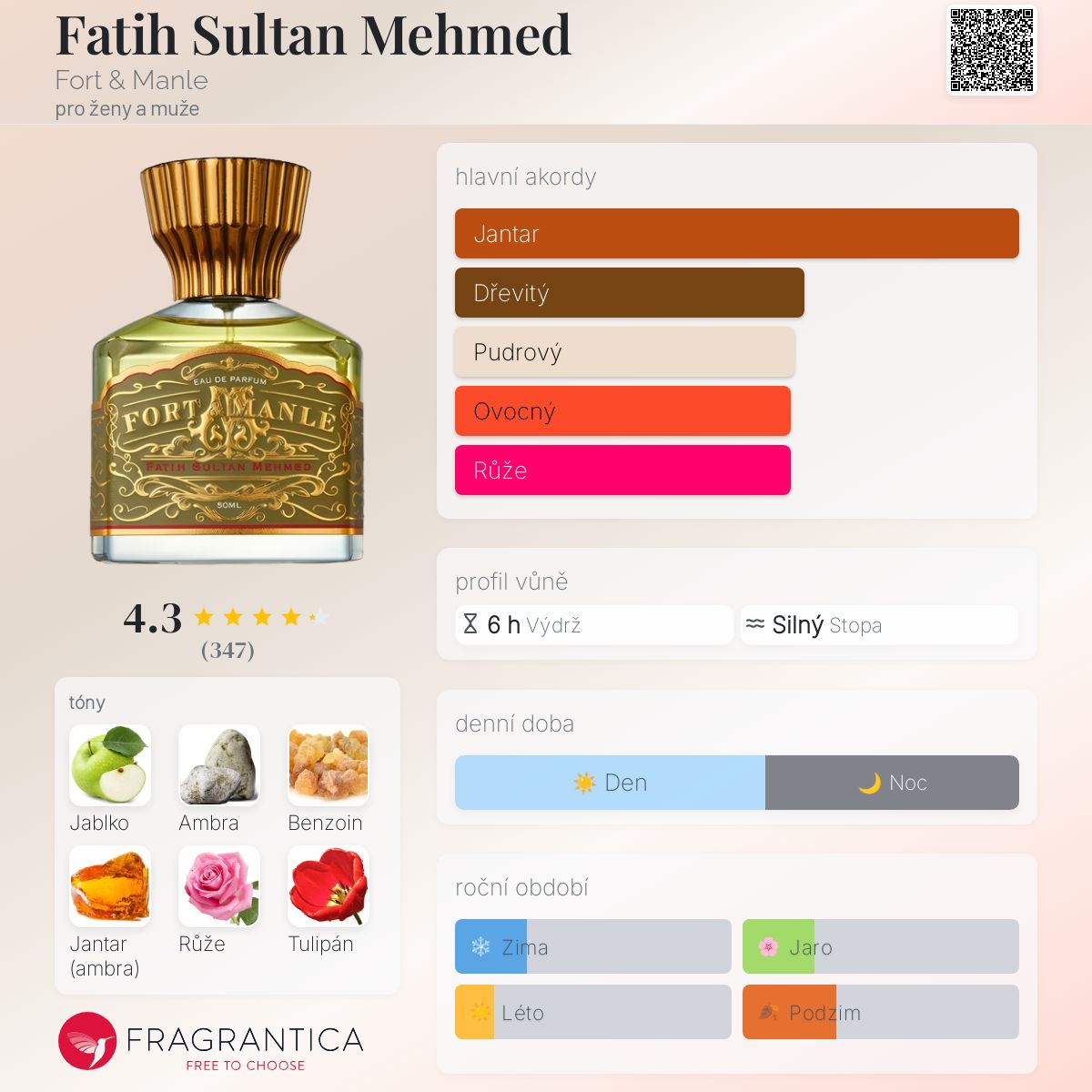 Fatih Sultan Mehmed podle Fort & Manle je Chypre Floral vůně pro ženy a muže. Fatih Sultan Mehmed byl/a uveden/a v roce 2016. "Nosem" za touto vůní je Rasei Fort. Vrchní tóny jsou Jablko, Petitgrain a Bergamot; střední tóny jsouAmbra, Damašská růže, Tulipán, Vanilka a Kosatec ; základní tóny jsou Benzoin, Jantar (ambra), Pačuli, Pižmo, Virginský cedr a Agarové dřevo (oud).