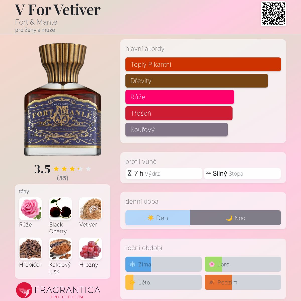 V For Vetiver podle Fort & Manle je Woody Spicy vůně pro ženy a muže. V For Vetiver byl/a uveden/a v roce 2023. "Nosem" za touto vůní je Rasei Fort.