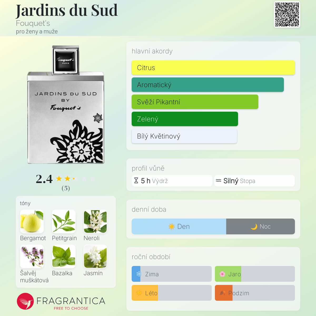 Jardins du Sud podle Fouquet's je Chypre vůně pro ženy a muže. Jardins du Sud byl/a uveden/a v roce 2013. Jardins du Sud byl/a vytvořen/a Christian Dussoulier, Jennifer Riley, Sébastien Martin a Corinne Cachen. Vrchní tóny jsou Bergamot, Petitgrain, Neroli a Citrón; střední tóny jsouŠalvěj muškátová, Bazalka, Jasmín a Levandule ; základní tóny jsou Dubový mech a Vetiver.