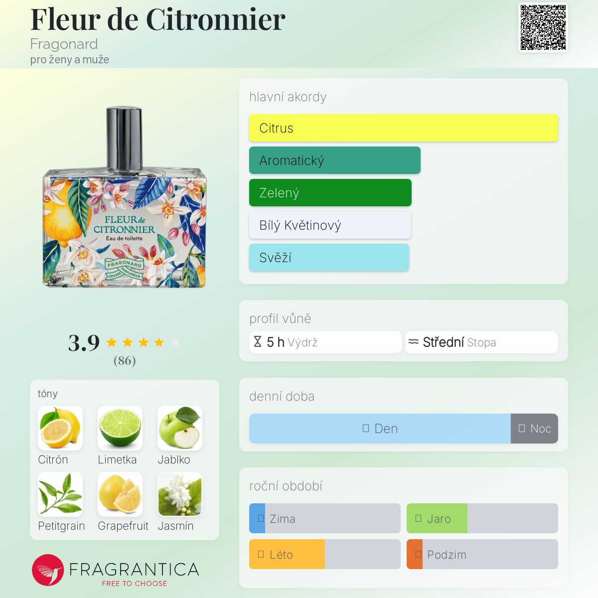 Fleur de Citronnier podle Fragonard je Citrus Aromatic vůně pro ženy a muže. Toto je nová vůně. Fleur de Citronnier byl/a uveden/a v roce 2025. "Nosem" za touto vůní je Karine Dubreuil-Sereni. Vrchní tóny jsou Italský citrón, Limetka, Grapefruit a Brazilský pomeranč; střední tóny jsouItalský citrón, Zelené jablko, Petitgrain a Divoký jasmín ; základní tóny jsou Bílé pižmo, Virginský cedr a Bílý jantar (ambra).